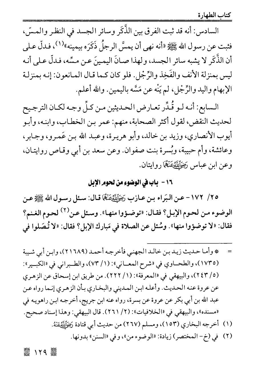 ٢٥/ ١٧٢ - عن البَراء بن عازب - رضي الله عنهما - قال: سئل رسول الله - صلى الله عليه وسلم - عن الوضوء من لحوم الإبل؟ فقال: "توضؤوا منها". وسئل عن (¬٢) لحوم الغنم؟ فقال: "لا توضؤوا منها". وسُئل عن الصلاة في مَبارك الإبل؟ فقال: "لا تُصَلوا في
