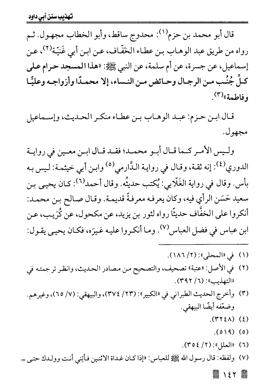 قال أبو محمد بن حزم (¬١): محدوج ساقط, وأبو الخطاب مجهول. ثم رواه من طريق عبد الوهاب بن عطاء الخَفّاف، عن ابن أبي غَنيّة (¬٢)، عن إسماعيل، عن جسرة، عن أم سلمة، عن النبي - صلى الله عليه وسلم -: "هذا المسجد حرام على كلِّ جُنُب من الرجال وحائض من النساء, إلا محمدًا وأزواجه وعليًّا وفاطمة" (¬٣).