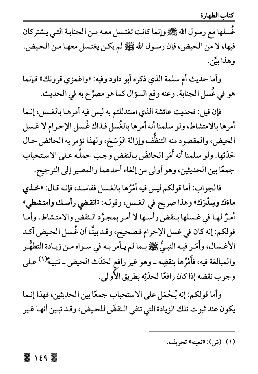 فإن قيل: فحديث عائشة الذي استدللتم به ليس فيه أمرها بالغسل, إنما أمرها بالامتشاط, ولو سلمنا أنه أمرها بالغُسل فذاك غُسل الإحرام لا غسل الحيض, والمقصود منه التنظُّف وإزالة الوَسَخ, ولهذا تؤمر به الحائض حال حَدَثها. ولو سلمنا أنه أَمَر الحائضَ بالنقض وجب حملُه على الاستحباب جمعًا بين الحديثين, وهو أولى من إلغاء أحدهما والمصير إلى الترجيح.