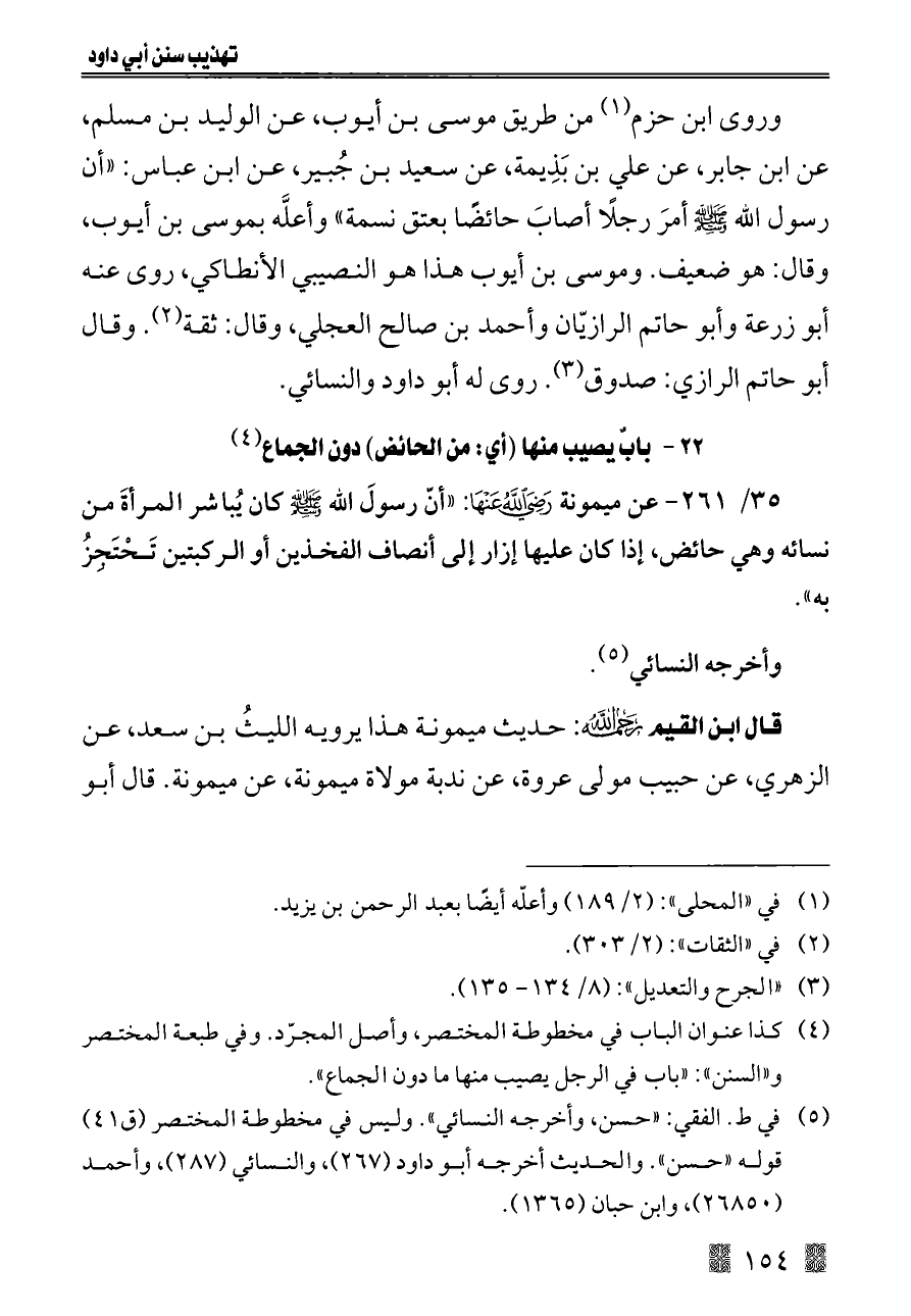 ٣٥/ ٢٦١ - عن ميمونة - رضي الله عنها -: "أنّ رسولَ الله - صلى الله عليه وسلم - كان يُباشر المرأةَ من نسائه وهي حائض، إذا كان عليها إزار إلى أنصاف الفخذين أو الركبتين تَحْتَجِزُ به".