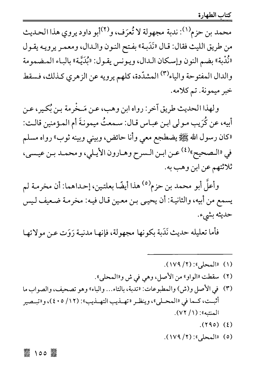 محمد بن حزم (¬١): ندبة مجهولة لا تُعرَف, و (¬٢) أبو داود يروي هذا الحديث من طريق الليث فقال: قال "نَدَبة" بفتح النون والدال, ومعمر يرويه يقول "نُدْبة" بضم النون وإسكان الدال, ويونس يقول: "بُدَيَّة" بالباء المضمومة والدال المفتوحة والياء (¬٣) المشدّدة, كلهم يرويه عن الزهري كذلك, فسقط خبر ميمونة. تم كلامه.