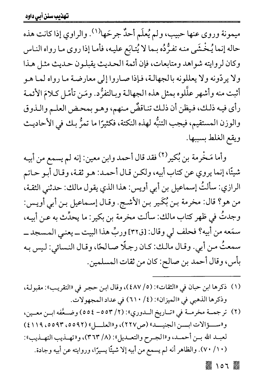 (¬٢) ترجمة مخرمة في "تاريخ الدوري": (٢/ ٥٥٣ - ٥٥٤) وضعَّفه ابن معين، و"سؤالات ابن الجنيد" (ص ٢٢٧)، و"العلل" (٥٥٩٢، ٥٥٩٣، ٤١١٩) لعبد الله بن أحمد، و"الجرح والتعديل": (٨/ ٣٦٣)، و"تهذيب التهذيب": (١٠/ ٧٠). والظاهر أنه لم يسمع من أبيه إلا شيئًا يسيرًا، وروايته عن أبيه وجادة.