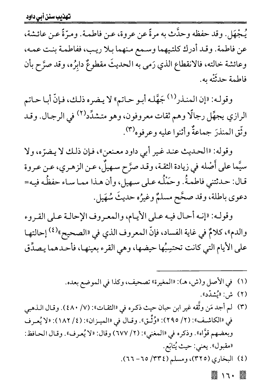 وقوله: "الحديث عند غير أبي داود معنعن", فإن ذلك لا يضرّه, ولا سيَّما على أَصْله في زيادة الثقة, وقد صرَّح سهيلٌ، عن الزهري، عن عروة قال: حدثتني فاطمةُ. وحَمْلُه على سهيل، وأن هذا مما ساء حفظُه فيه= دعوى باطلة, وقد صحَّح مسلمٌ وغيرُه حديثَ سُهَيل.