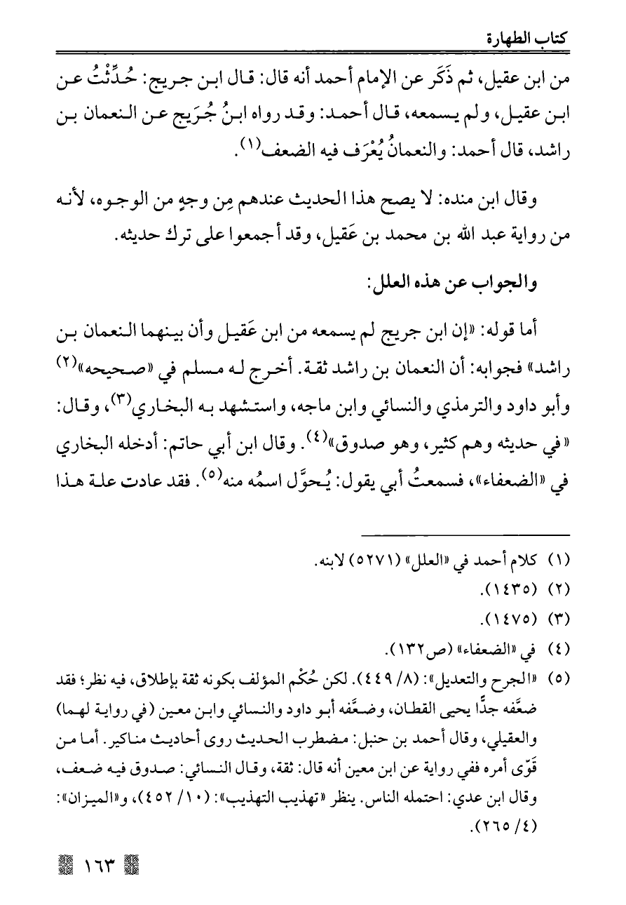 أما قوله: "إن ابن جريج لم يسمعه من ابن عَقيل وأن بينهما النعمان بن راشد" فجوابه: أن النعمان بن راشد ثقة. أخرج له مسلم في "صحيحه" (¬٢) وأبو داود والترمذي والنسائي وابن ماجه, واستشهد به البخاري (¬٣) , وقال: "في حديثه وهم كثير, وهو صدوق" (¬٤). وقال ابن أبي حاتم: أدخله البخاري في "الضعفاء"، فسمعتُ أبي يقول: يُحوَّل اسمُه منه (¬٥). فقد عادت علة هذا