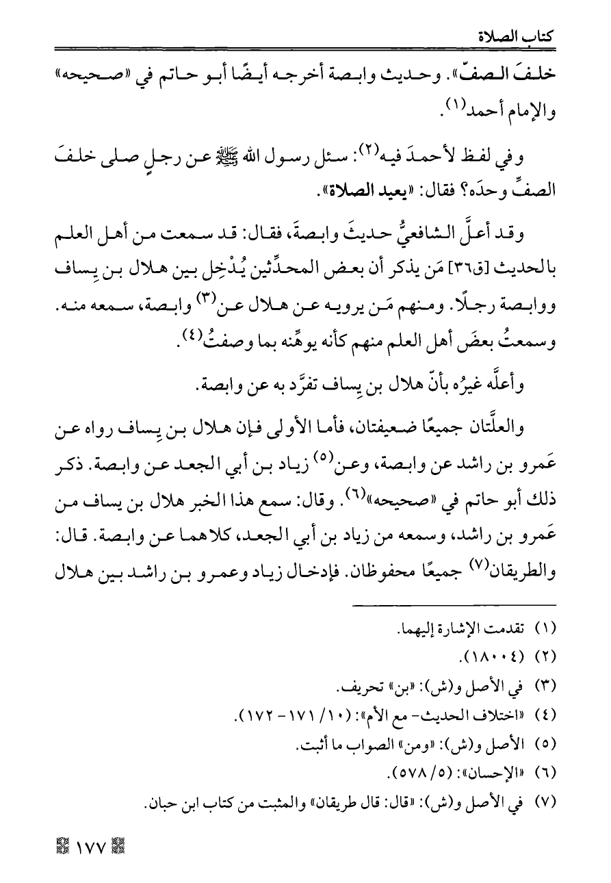 ولفظ أحمد عنه: «أن رسول الله - صلى الله عليه وسلم - رأى رجلًا يصلي خلف الصف, فوقف حتى انصرف الرجلُ, فقال له: «استقبل صلاتك, فإنه لا صلاة لفردٍ خلفَ الصفّ». وحديث وابصة أخرجه أيضًا أبو حاتم في «صحيحه» والإمام أحمد (¬١).