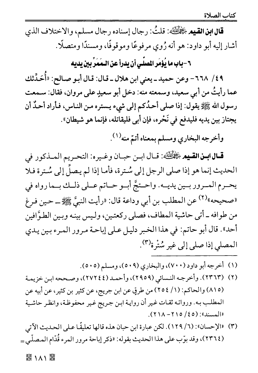 (¬٣). «الإحسان»: (٦/ ١٢٩). لكن عبارة ابن حبان هذه قالها تعليقًا على الحديث الآتي (٢٣٦٤)، وقد بوّب على هذا الحديث بقوله: «ذكر إباحة مرور المرء قُدّام المصلّي إذا صلى إلى غير سُترة».