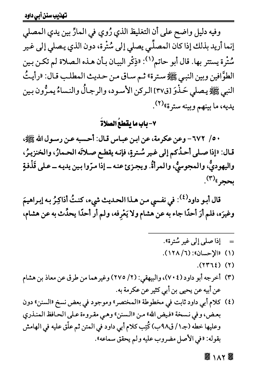 (¬٤). كلام أبي داود ثابت في مخطوطة «المختصر» وموجود في بعض نسخ «السنن» دون بعض، وفي نسخة «فيض الله» من «السنن» وهي مقروءة على الحافظ المنذري وعليها خطه (جـ ١/ق ٩٨ ب) كُتِب كلام أبي داود في المتن ثم علّق عليه في الهامش بقوله: «في الأصل مضروب عليه ولم يحقق سماعه».