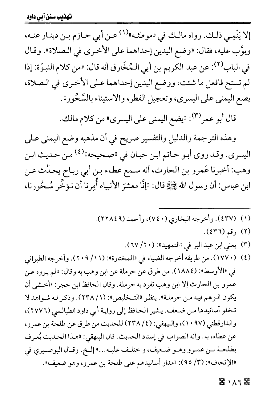 وهذه الترجمة والدليل والتفسير صريح في أن مذهبه وضع اليمنى على اليسرى. وقد روى أبو حاتم ابن حبان في «صحيحه» (¬٤) من حديث ابن وهب: أخبرنا عَمرو بن الحارث، أنه سمع عطاء بن أبي رباح يحدِّث عن ابن عباس: أن رسول الله - صلى الله عليه وسلم - قال: «إنَّا معشرَ الأنبياء أُمِرنا أن نؤخِّر سُحُورنا,