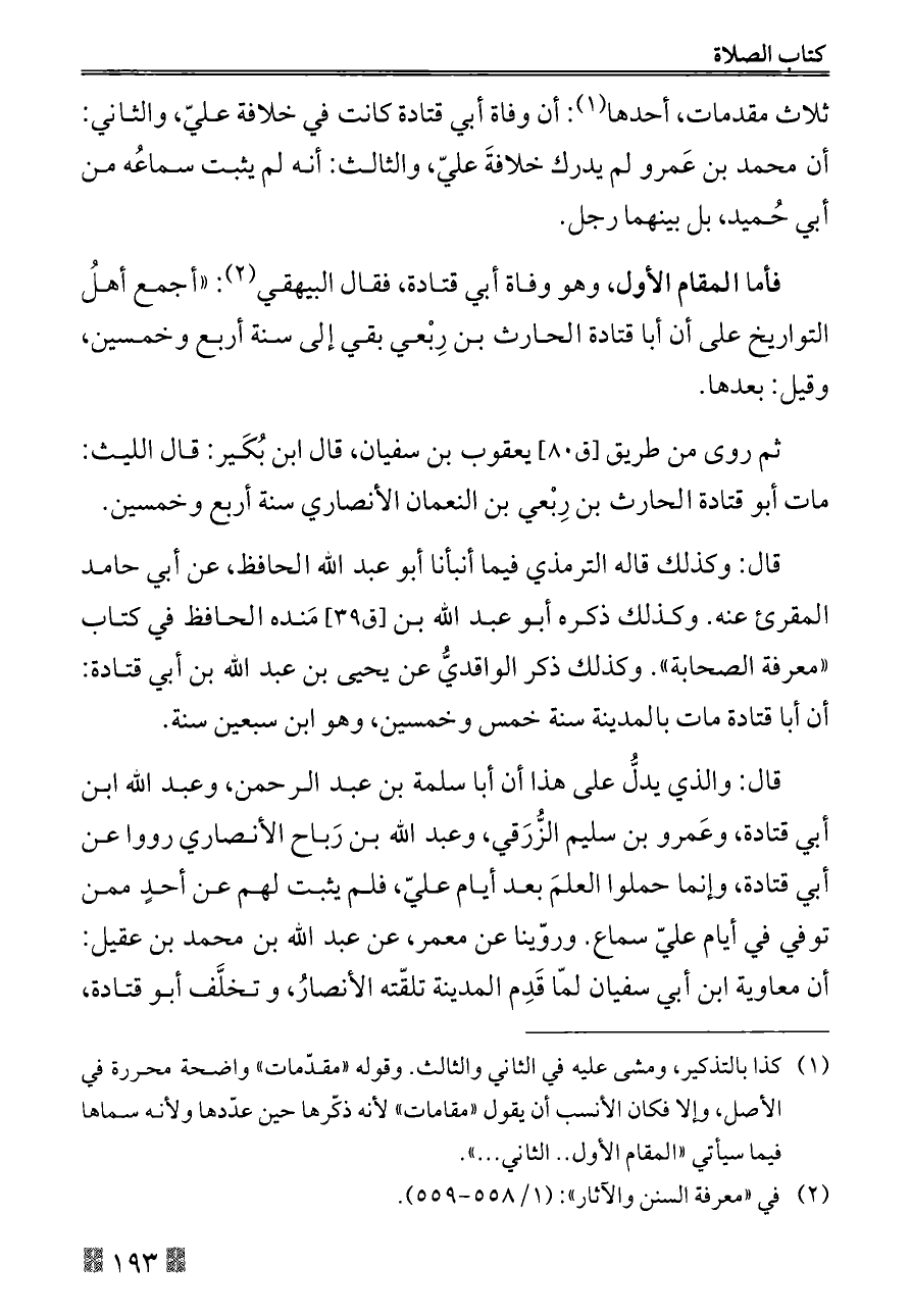 ثلاث مقدمات، أحدها (¬١): أن وفاة أبي قتادة كانت في خلافة عليّ، والثاني: أن محمد بن عَمرو لم يدرك خلافةَ عليّ، والثالث: أنه لم يثبت سماعُه من أبي حُميد، بل بينهما رجل.