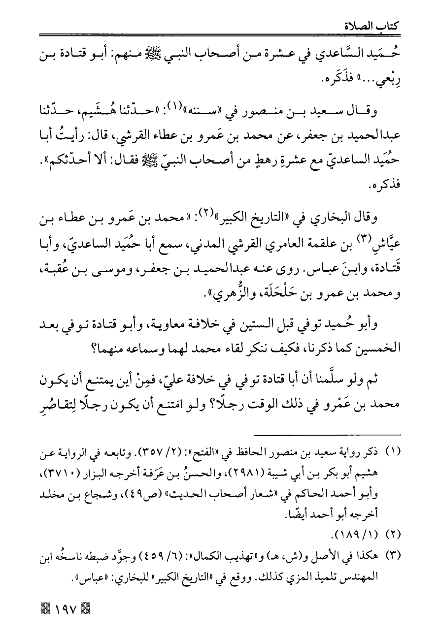 وقال سعيد بن منصور في «سننه» (¬١): «حدّثنا هُشَيم، حدّثنا عبدالحميد بن جعفر، عن محمد بن عَمرو بن عطاء القرشي، قال: رأيتُ أبا حُمَيد الساعديّ مع عشرةِ رهطٍ من أصحاب النبيّ - صلى الله عليه وسلم - فقال: ألا أحدّثكم». فذكره.