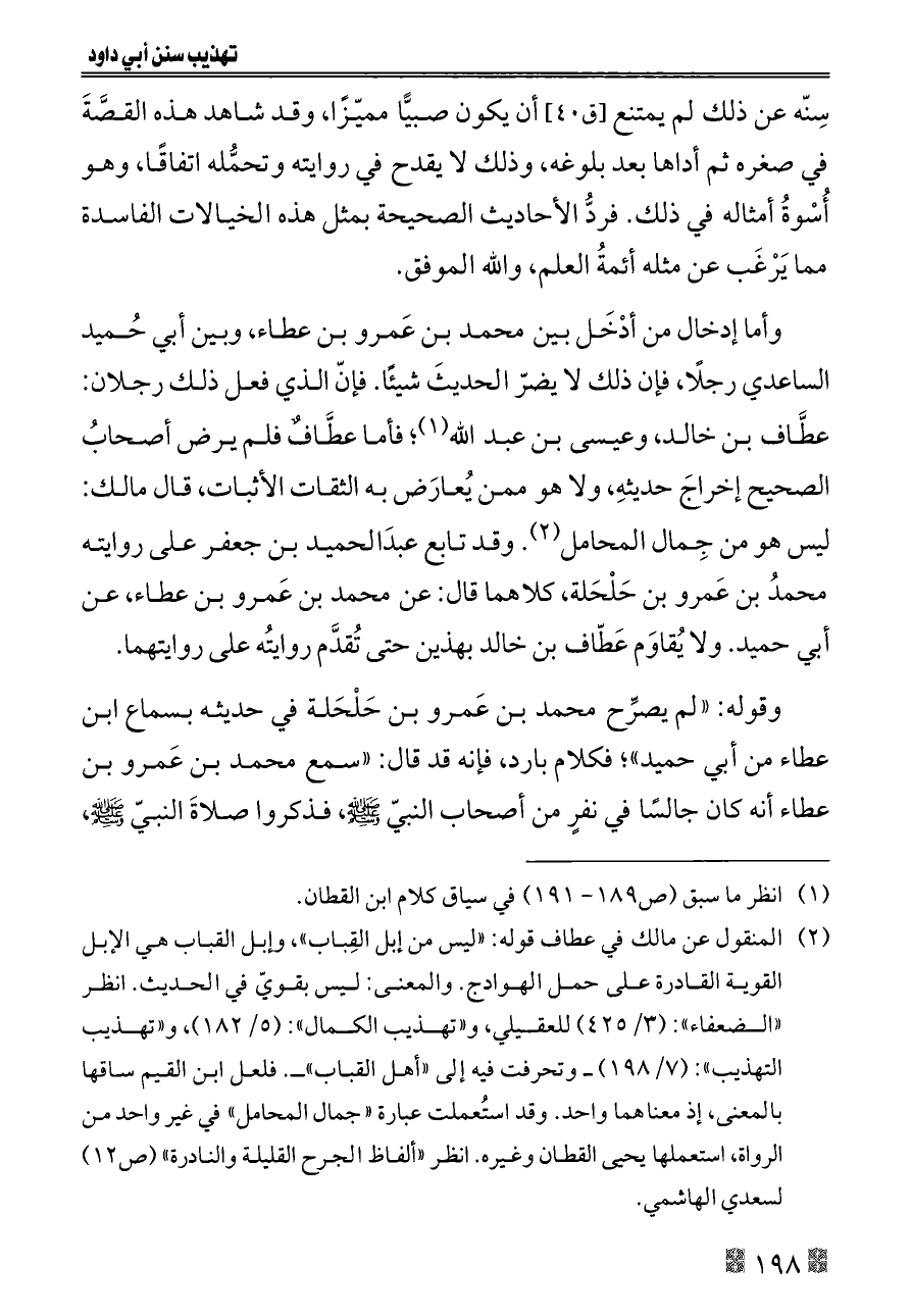 (¬٢) المنقول عن مالك في عطاف قوله: «ليس من إبل القِباب»، وإبل القباب هي الإبل القوية القادرة على حمل الهوادج. والمعنى: ليس بقويّ في الحديث. انظر «الضعفاء»: (٣/ ٤٢٥) للعقيلي، و «تهذيب الكمال»: (٥/ ١٨٢)، و «تهذيب التهذيب»: (٧/ ١٩٨) ــ وتحرفت فيه إلى «أهل القباب» ــ. فلعل ابن القيم ساقها بالمعنى، إذ معناهما واحد. وقد استُعملت عبارة «جمال المحامل» في غير واحد من الرواة، استعملها يحيى القطان وغيره. انظر «ألفاظ الجرح القليلة والنادرة» (ص ١٢) لسعدي الهاشمي.