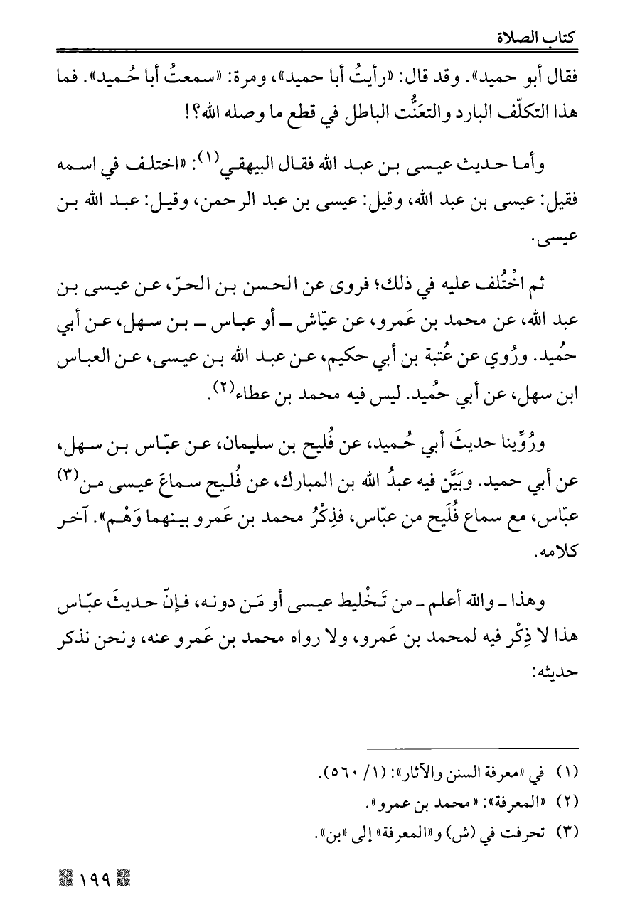 ورُوِّينا حديثَ أبي حُميد، عن فُليح بن سليمان، عن عبّاس بن سهل، عن أبي حميد. وبَيَّن فيه عبدُ الله بن المبارك، عن فُليح سماعَ عيسى من (¬٣) عبّاس، مع سماع فُلَيح من عبّاس، فذِكْرُ محمد بن عَمرو بينهما وَهْم». آخر كلامه.
