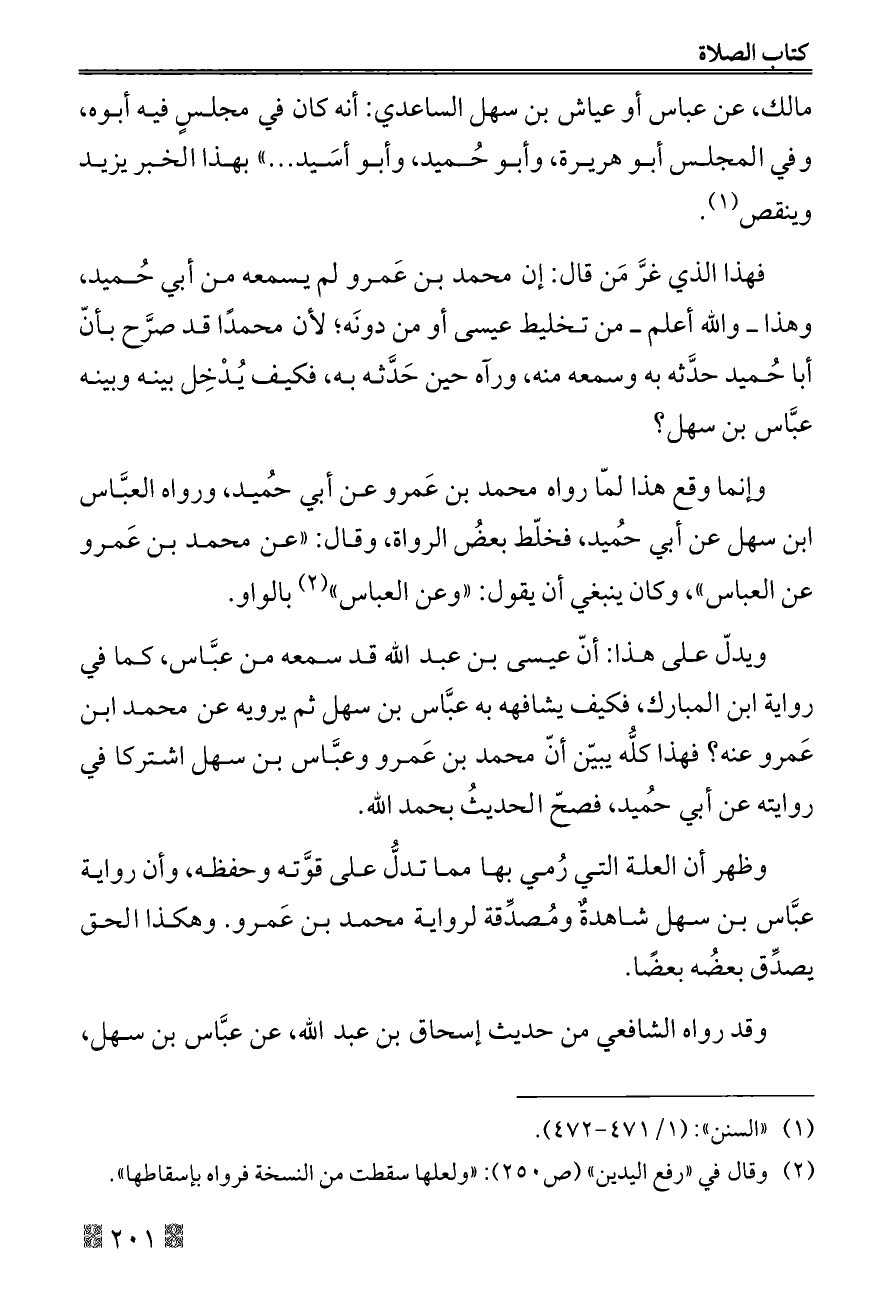 فهذا الذي غرَّ مَن قال: إن محمد بن عَمرو لم يسمعه من أبي حُميد، وهذا ــ والله أعلم ــ من تخليط عيسى أو من دونَه؛ لأن محمدًا قد صرَّح بأنّ أبا حُميد حدَّثه به وسمعه منه, ورآه حين حَدَّثه به, فكيف يُدْخِل بينه وبينه عبَّاس بن سهل؟