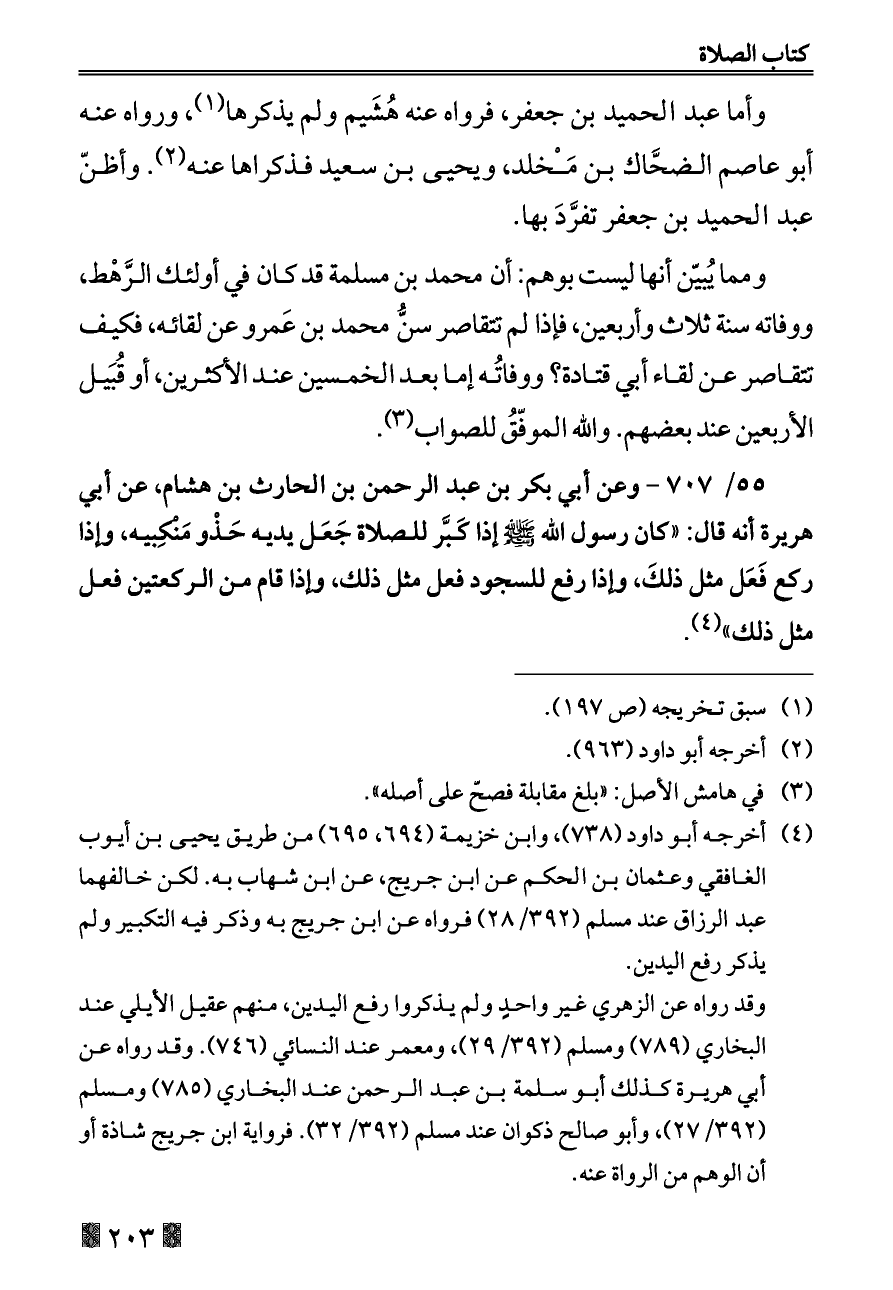 ٥٥/ ٧٠٧ - وعن أبي بكر بن عبد الرحمن بن الحارث بن هشام، عن أبي هريرة أنه قال: «كان رسول الله - صلى الله عليه وسلم - إذا كَبَّر للصلاة جَعَل يديه حَذْو مَنْكِبيه، وإذا ركع فَعَل مثل ذلكَ، وإذا رفع للسجود فعل مثل ذلك، وإذا قام من الركعتين فعل مثل ذلك» (¬٤).