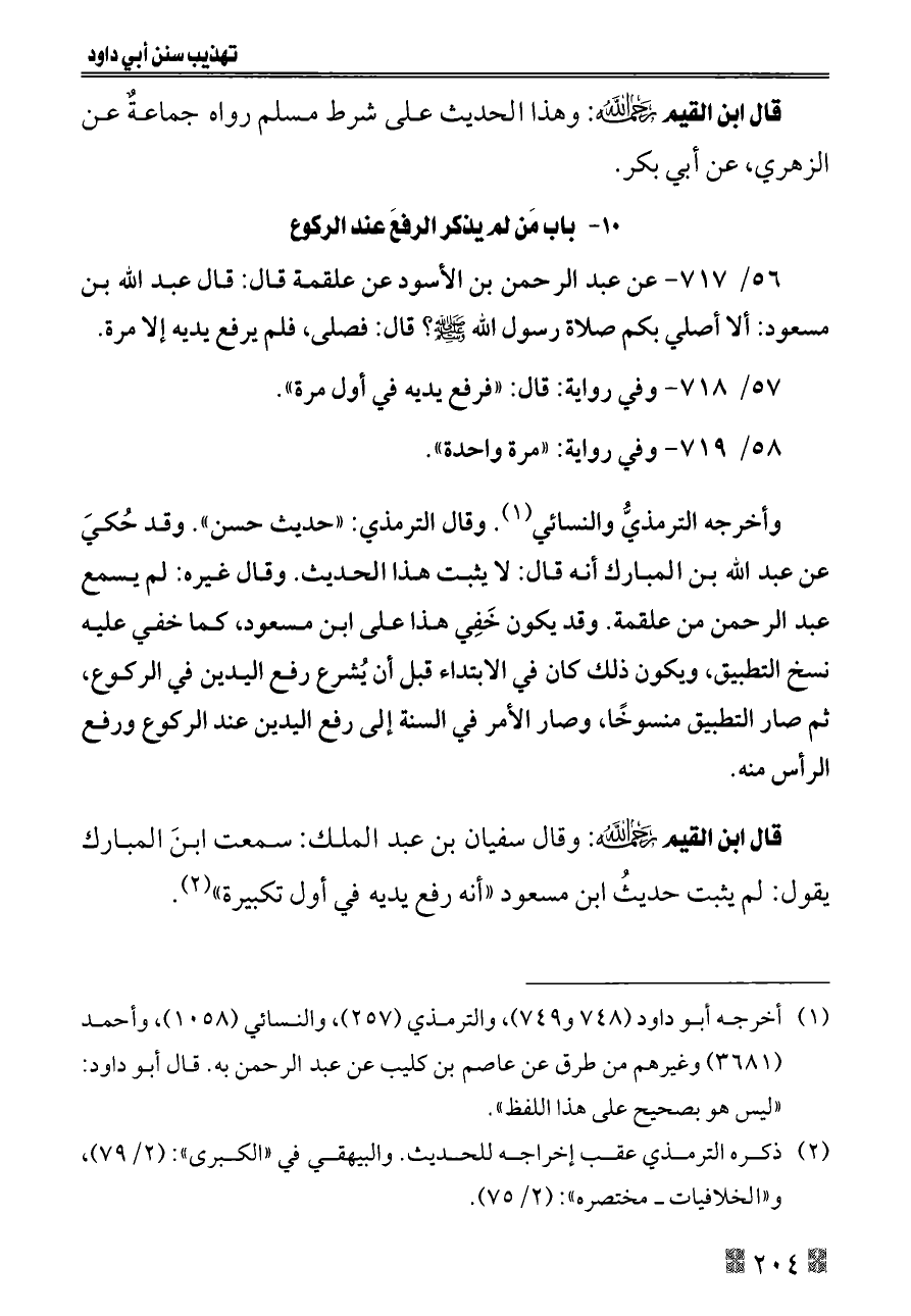 وأخرجه الترمذيُّ والنسائي (¬١). وقال الترمذي: «حديث حسن». وقد حُكيَ عن عبد الله بن المبارك أنه قال: لا يثبت هذا الحديث. وقال غيره: لم يسمع عبد الرحمن من علقمة. وقد يكون خَفِي هذا على ابن مسعود، كما خفي عليه نسخ التطبيق، ويكون ذلك كان في الابتداء قبل أن يُشرع رفع اليدين في الركوع، ثم صار التطبيق منسوخًا، وصار الأمر في السنة إلى رفع اليدين عند الركوع ورفع الرأس منه.