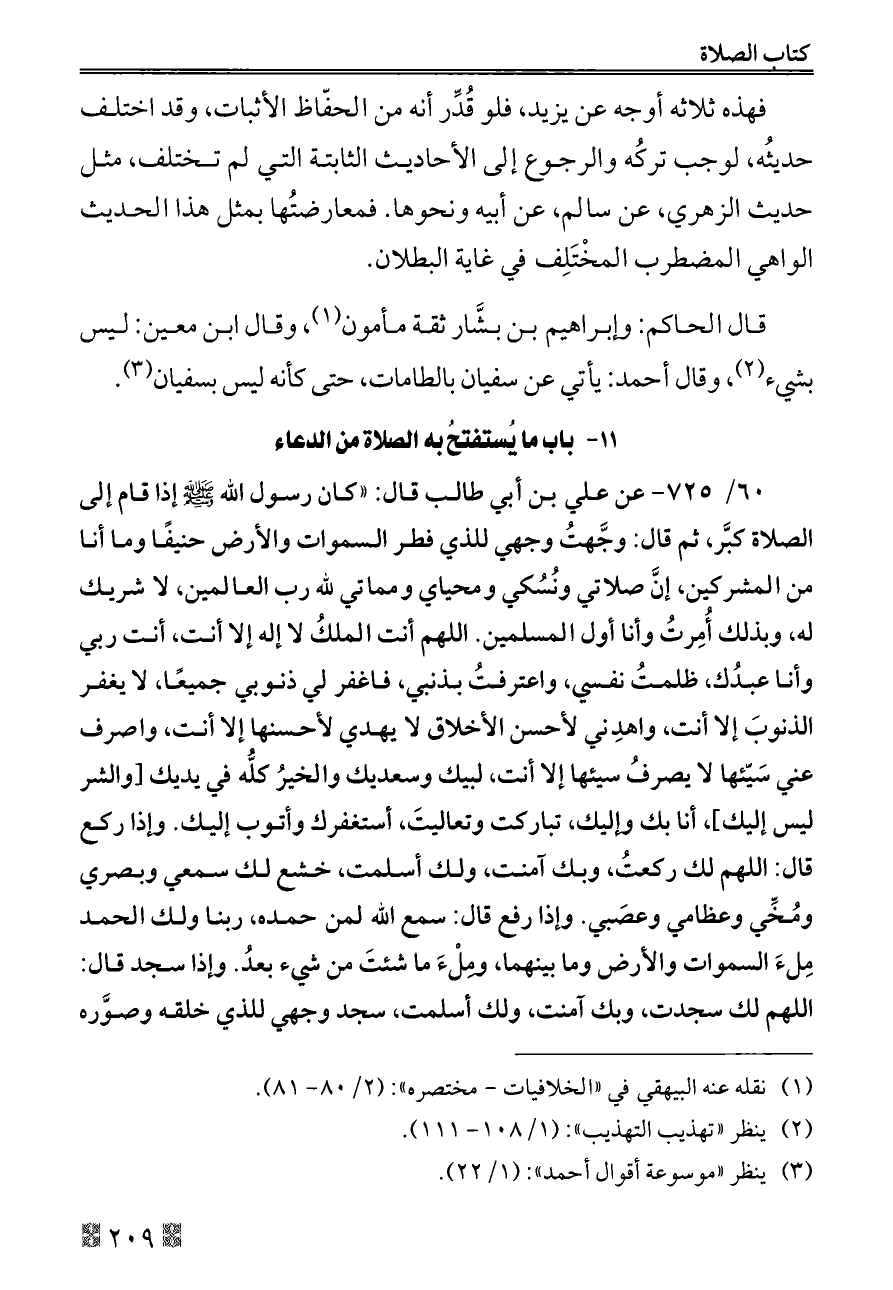 ٦٠/ ٧٢٥ - عن علي بن أبي طالب قال: «كان رسول الله - صلى الله عليه وسلم - إذا قام إلى الصلاة كبَّر، ثم قال: وجَّهتُ وجهي للذي فطر السموات والأرض حنيفًا وما أنا من المشركين، إنَّ صلاتي ونُسُكي ومحياي ومماتي لله رب العالمين، لا شريك له، وبذلك أُمِرتُ وأنا أول المسلمين. اللهم أنت الملكُ لا إله إلا أنت، أنت ربي وأنا عبدُك، ظلمتُ نفسي، واعترفتُ بذنبي، فاغفر لي ذنوبي جميعًا، لا يغفر الذنوبَ إلا أنت، واهدِني لأحسن الأخلاق لا يهدي لأحسنها إلا أنت، واصرف عني سَيّئها لا يصرفُ سيئها إلا أنت، لبيك وسعديك والخيرُ كلُّه في يديك [والشر ليس إليك]، أنا بك وإليك، تباركت وتعاليتَ، أستغفرك وأتوب إليك. وإذا ركع قال: اللهم لك ركعتُ، وبك آمنت، ولك أسلمت، خشع لك سمعي وبصري ومُخِّي وعظامي وعصَبي. وإذا رفع قال: سمع الله لمن حمده، ربنا ولك الحمد مِلءَ السموات والأرض وما بينهما، ومِلْءَ ما شئتَ من شيء بعدُ. وإذا سجد قال: اللهم لك سجدت، وبك آمنت، ولك أسلمت، سجد وجهي للذي خلقه وصوَّره