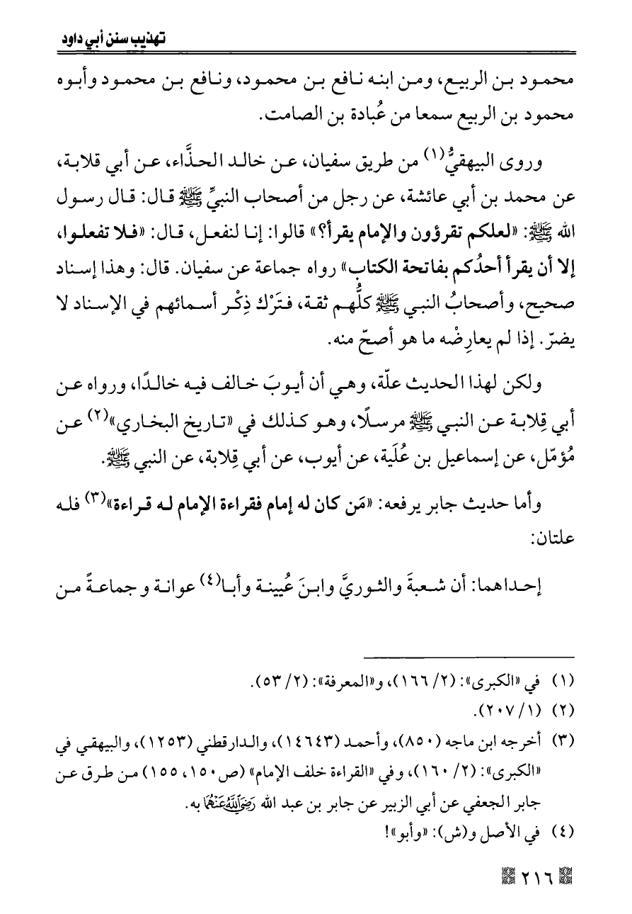 وروى البيهقيُّ (¬١) من طريق سفيان، عن خالد الحذَّاء، عن أبي قلابة، عن محمد بن أبي عائشة، عن رجل من أصحاب النبيِّ - صلى الله عليه وسلم - قال: قال رسول الله - صلى الله عليه وسلم -: «لعلكم تقرؤون والإمام يقرأ؟» قالوا: إنا لنفعل, قال: «فلا تفعلوا, إلا أن يقرأ أحدُكم بفاتحة الكتاب» رواه جماعة عن سفيان. قال: وهذا إسناد صحيح، وأصحابُ النبي - صلى الله عليه وسلم - كلُّهم ثقة, فتَرْك ذِكْر أسمائهم في الإسناد لا يضرّ. إذا لم يعارِضْه ما هو أصحّ منه.