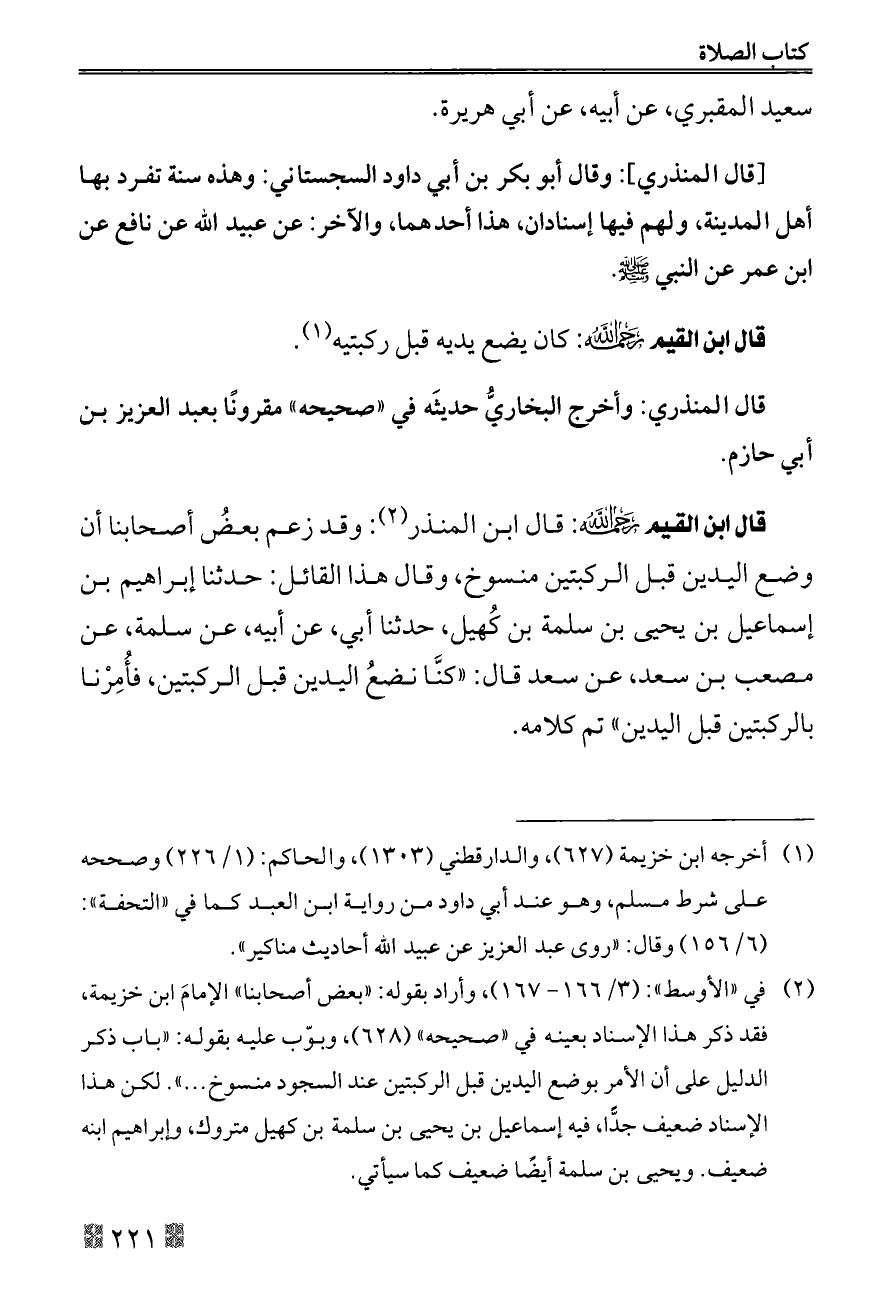 قال ابن القيم - رحمه الله -: قال ابن المنذر (¬٢): وقد زعم بعضُ أصحابنا أن وضع اليدين قبل الركبتين منسوخ، وقال هذا القائل: حدثنا إبراهيم بن إسماعيل بن يحيى بن سلمة بن كُهيل, حدثنا أبي، عن أبيه، عن سلمة، عن مصعب بن سعد، عن سعد قال: «كنَّا نضعُ اليدين قبل الركبتين، فأُمِرْنا بالركبتين قبل اليدين» تم كلامه.