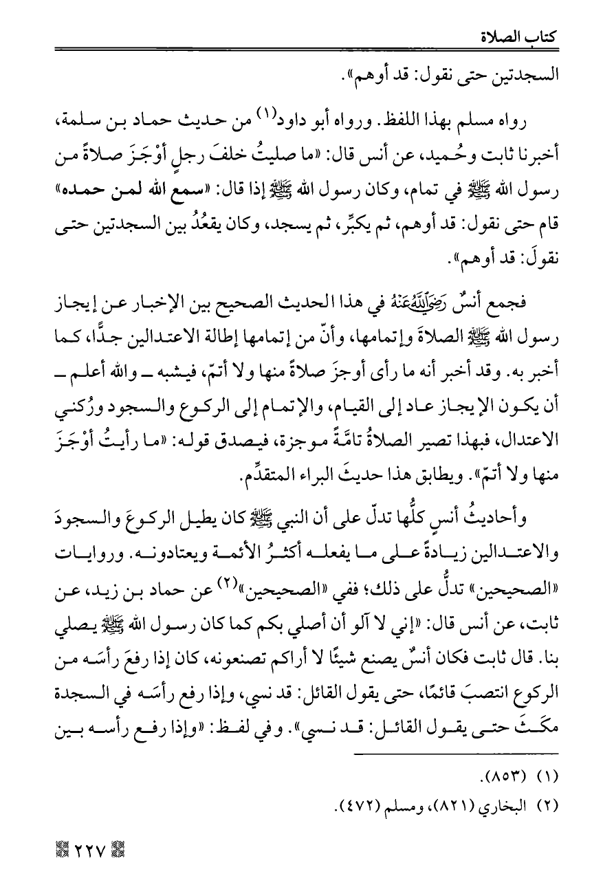 رواه مسلم بهذا اللفظ. ورواه أبو داود (¬١) من حديث حماد بن سلمة، أخبرنا ثابت وحُميد، عن أنس قال: «ما صليتُ خلفَ رجلٍ أوْجَزَ صلاةً من رسول الله - صلى الله عليه وسلم - في تمام, وكان رسول الله - صلى الله عليه وسلم - إذا قال: «سمع الله لمن حمده» قام حتى نقول: قد أوهم, ثم يكبِّر, ثم يسجد, وكان يقعُدُ بين السجدتين حتى نقولَ: قد أوهم».