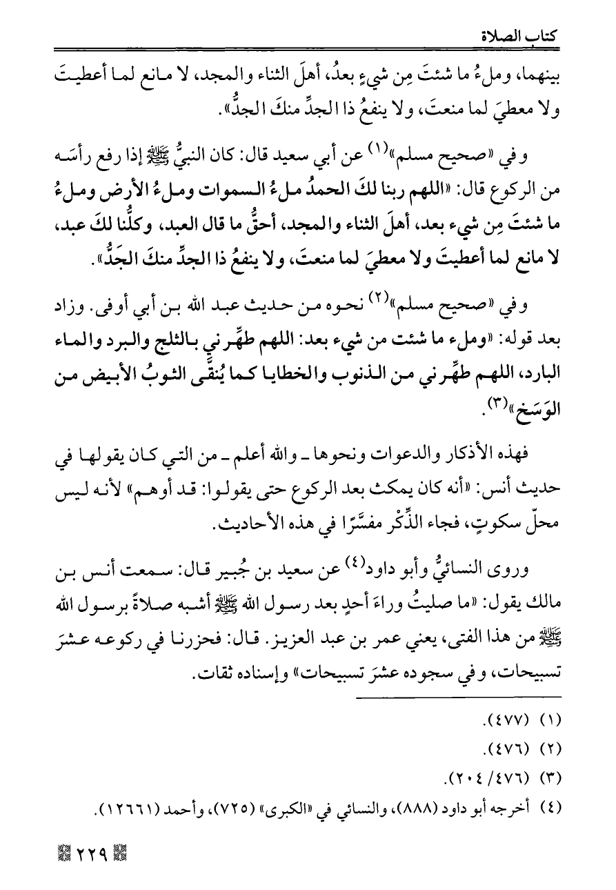 وفي «صحيح مسلم» (¬١) عن أبي سعيد قال: كان النبيُّ - صلى الله عليه وسلم - إذا رفع رأسَه من الركوع قال: «اللهم ربنا لكَ الحمدُ ملءُ السموات وملءُ الأرض وملءُ ما شئتَ مِن شيء بعد, أهلَ الثناء والمجد, أحقُّ ما قال العبد، وكلُّنا لكَ عبد, لا مانع لما أعطيتَ ولا معطيَ لما منعتَ, ولا ينفعُ ذا الجدِّ منكَ الجَدُّ».
