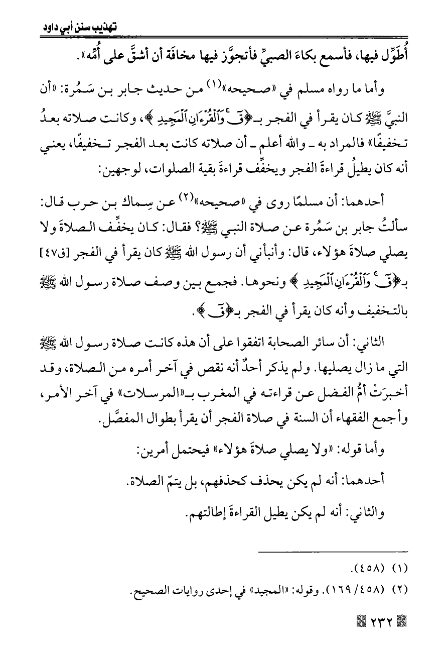 وأما ما رواه مسلم في «صحيحه» (¬١) من حديث جابر بن سَمُرة: «أن النبيَّ - صلى الله عليه وسلم - كان يقرأ في الفجر بـ {ق وَالْقُرْآنِ الْمَجِيدِ} , وكانت صلاته بعدُ تخفيفًا» فالمراد به ــ والله أعلم ــ أن صلاته كانت بعد الفجر تخفيفًا, يعني أنه كان يطيلُ قراءةَ الفجر ويخفِّف قراءةَ بقية الصلوات، لوجهين: