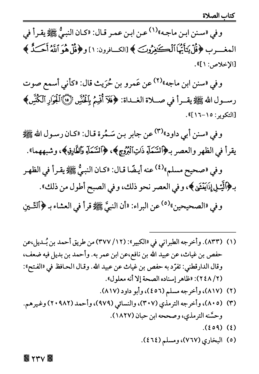 وفي «سنن ابن ماجه» (¬٢) عن عَمرو بن حُرَيث قال: «كأني أسمع صوت رسول الله - صلى الله عليه وسلم - يقرأ في صلاة الغداة: {فَلَا أُقْسِمُ بِالْخُنَّسِ (١٥) الْجَوَارِ الْكُنَّسِ} [التكوير: ١٥ - ١٦]».