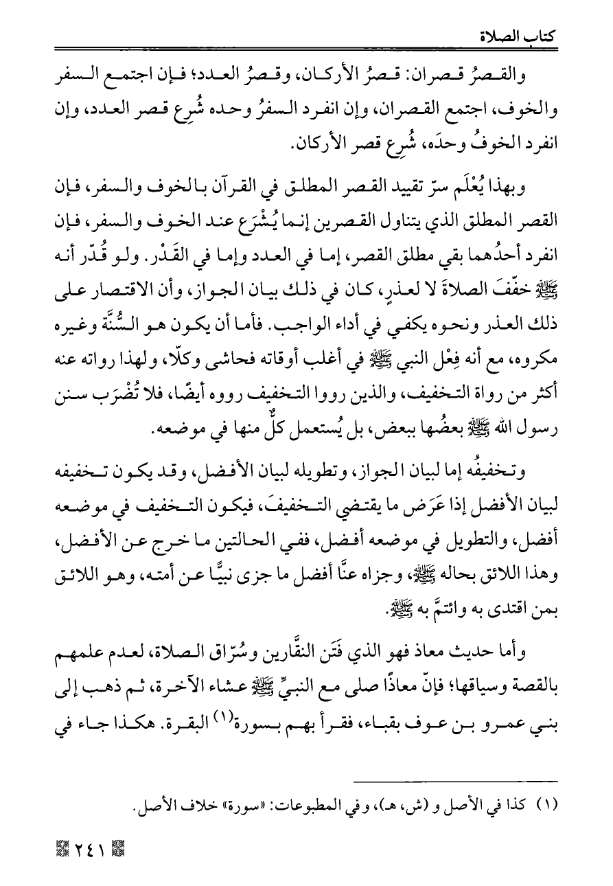 وبهذا يُعْلَم سرّ تقييد القصر المطلق في القرآن بالخوف والسفر, فإن القصر المطلق الذي يتناول القصرين إنما يُشْرَع عند الخوف والسفر، فإن انفرد أحدُهما بقي مطلق القصر, إما في العدد وإما في القَدْر. ولو قُدّر أنه - صلى الله عليه وسلم - خفّفَ الصلاةَ لا لعذرٍ, كان في ذلك بيان الجواز, وأن الاقتصار على ذلك العذر ونحوه يكفي في أداء الواجب. فأما أن يكون هو السُّنَّة وغيره مكروه, مع أنه فِعْل النبي - صلى الله عليه وسلم - في أغلب أوقاته فحاشى وكلّا, ولهذا رواته عنه أكثر من رواة التخفيف, والذين رووا التخفيف رووه أيضًا, فلا تُضْرَب سنن رسول الله - صلى الله عليه وسلم - بعضُها ببعض, بل يُستعمل كلٌّ منها في موضعه.
