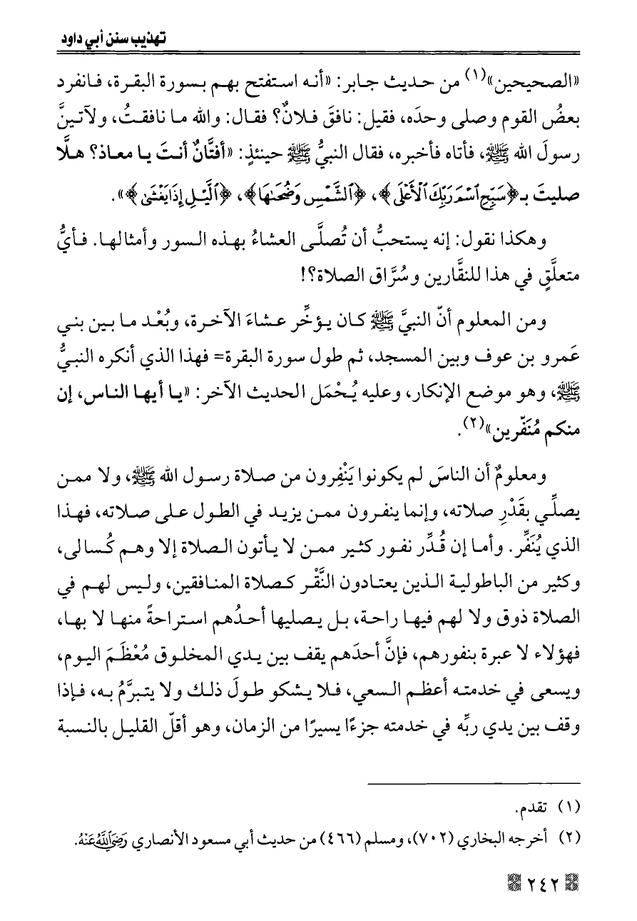 ومن المعلوم أنّ النبيَّ - صلى الله عليه وسلم - كان يؤخِّر عشاءَ الآخرة، وبُعْد ما بين بني عَمرو بن عوف وبين المسجد, ثم طول سورة البقرة= فهذا الذي أنكره النبيُّ - صلى الله عليه وسلم -، وهو موضع الإنكار, وعليه يُحْمَل الحديث الآخر: «يا أيها الناس، إن منكم مُنَفّرين» (¬٢).