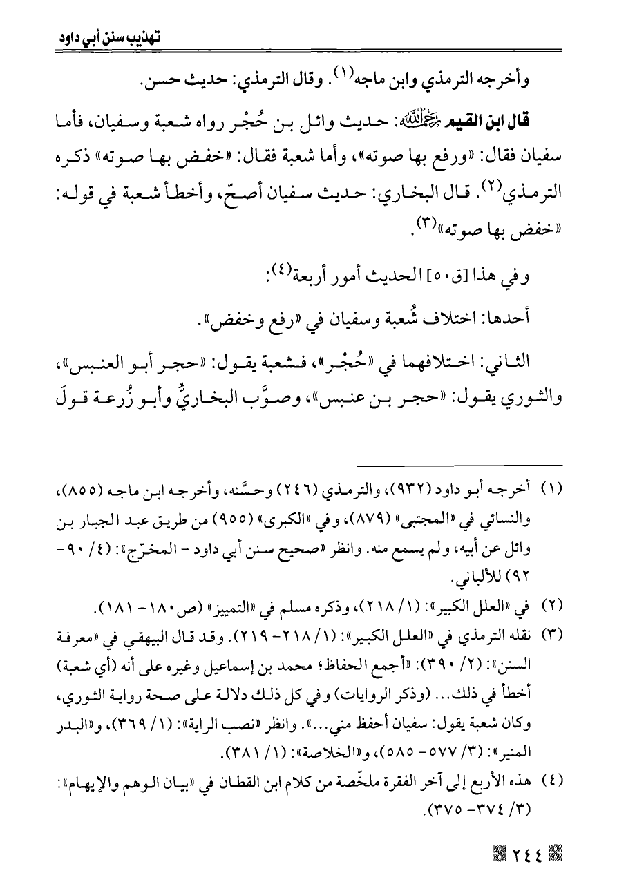 قال ابن القيم - رحمه الله -: حديث وائل بن حُجْر رواه شعبة وسفيان, فأما سفيان فقال: «ورفع بها صوته»، وأما شعبة فقال: «خفض بها صوته» ذكره الترمذي (¬٢). قال البخاري: حديث سفيان أصحّ, وأخطأ شعبة في قوله: «خفض بها صوته» (¬٣).