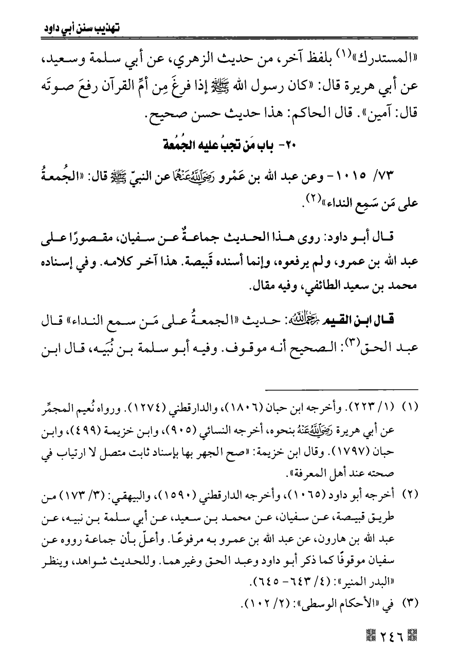 ٧٣/ ١٠١٥ - وعن عبد الله بن عَمْرو - رضي الله عنهما - عن النبيّ - صلى الله عليه وسلم - قال: «الجُمعةُ على مَن سَمِع النداء» (¬٢).