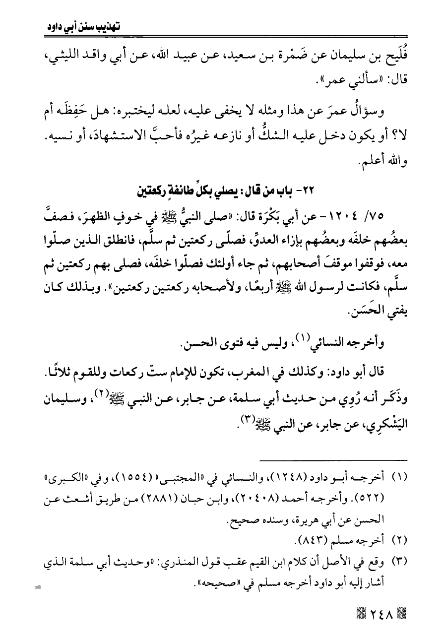 ٧٥/ ١٢٠٤ - عن أبي بَكْرَة قال: «صلى النبيُّ - صلى الله عليه وسلم - في خوفٍ الظهرَ، فصفَّ بعضُهم خلفَه وبعضُهم بإزاء العدوِّ، فصلّى ركعتين ثم سلَّم، فانطلق الذين صلّوا معه، فوقفوا موقفَ أصحابهم، ثم جاء أولئك فصلّوا خلفَه، فصلى بهم ركعتين ثم سلَّم، فكانت لرسول الله - صلى الله عليه وسلم - أربعًا، ولأصحابه ركعتين ركعتين». وبذلك كان يفتي الحَسَن.