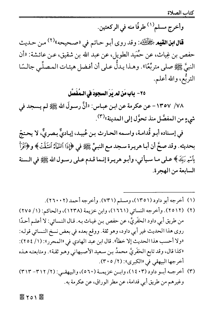 ٧٨/ ١٣٥٧ - عن عكرمة عن ابن عباس: «أنَّ رسولَ الله - صلى الله عليه وسلم - لم يسجد في شيءٍ من المفصَّل منذ تحوَّل إلى المدينة» (¬٣).