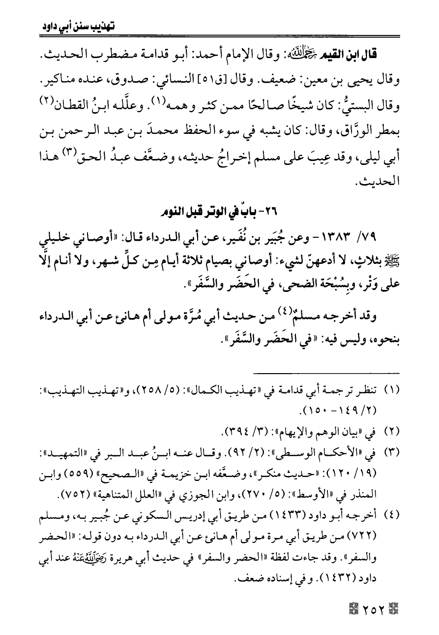 ٧٩/ ١٣٨٣ - وعن جُبَير بن نُفَير، عن أبي الدرداء قال: «أوصاني خليلي - صلى الله عليه وسلم - بثلاثٍ، لا أدعهنّ لشيء: أوصاني بصيام ثلاثة أيام مِن كلِّ شهر، ولا أنام إلَّا على وَتْر، وبِسُبْحَة الضحى، في الحَضَر والسَّفَر».
