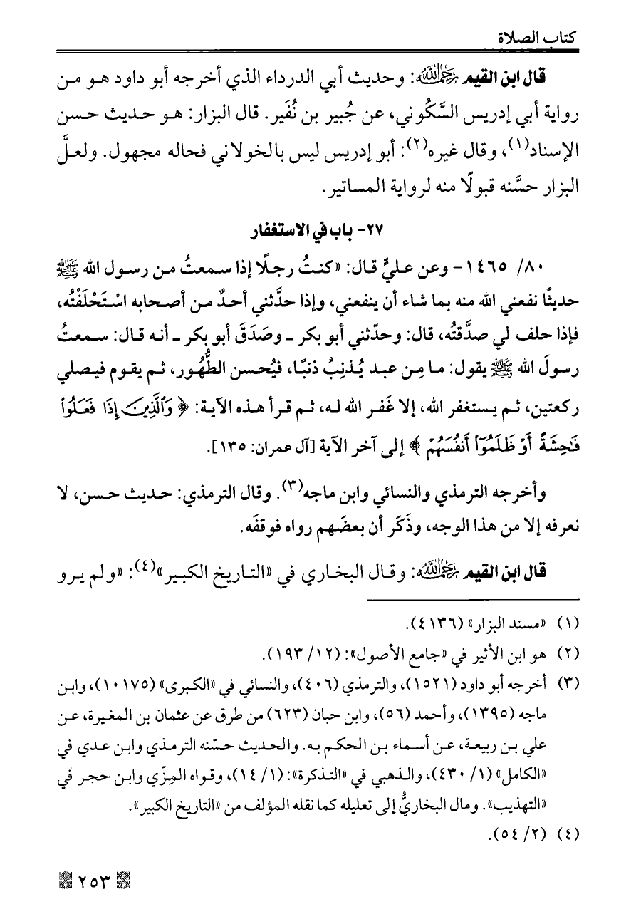 ٨٠/ ١٤٦٥ - وعن عليٍّ قال: «كنتُ رجلًا إذا سمعتُ من رسول الله - صلى الله عليه وسلم - حديثًا نفعني الله منه بما شاء أن ينفعني، وإذا حدَّثني أحدٌ من أصحابه اسْتَحْلَفْتُه، فإذا حلف لي صدَّقتُه، قال: وحدّثني أبو بكر ــ وصَدَقَ أبو بكر ــ أنه قال: سمعتُ رسولَ الله - صلى الله عليه وسلم - يقول: ما مِن عبد يُذنِبُ ذنبًا، فيُحسن الطُّهُور، ثم يقوم فيصلي ركعتين، ثم يستغفر الله، إلا غَفر الله له، ثم قرأ هذه الآية: {وَالَّذِينَ إِذَا فَعَلُوا فَاحِشَةً أَوْ ظَلَمُوا أَنْفُسَهُمْ} إلى آخر الآية [آل عمران: ١٣٥].