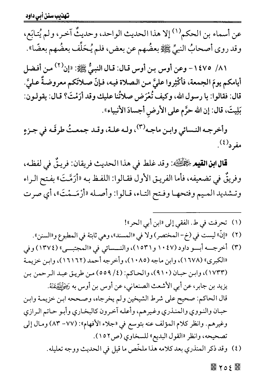 ٨١/ ١٤٧٥ - وعن أوس بن أوس قال: قال النبيُّ - صلى الله عليه وسلم -: «إن (¬٢) من أفضل أيامكم يومَ الجمعة، فأكْثِروا عليَّ من الصلاة فيه، فإنّ صلاتَكم معروضةٌ عليَّ. قال: فقالوا: يا رسول الله، وكيف تُعْرَض صلاتُنا عليك وقد أرَمْتَ؟ قال: يقولون: بَلِيتَ، قال: إن الله حرَّم على الأرضِ أجسادَ الأنبياء».