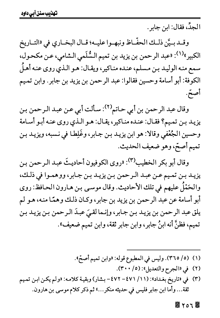 (¬٣). في «تاريخ بغداد»: (١١/ ٤٧١ - ٤٧٢ - بشار) وبقية كلامه: «ولم يكن ابن تميم ثقة ... وأما ابن جابر فليس في حديثه منكر ... » ثم ذكر كلام موسى بن هارون.