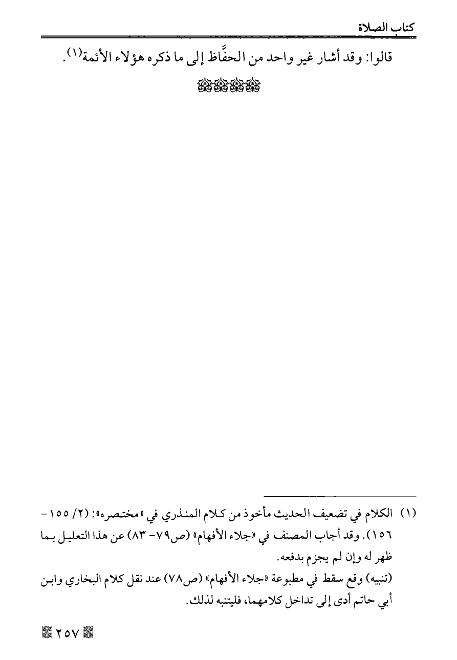 (تنبيه) وقع سقط في مطبوعة «جلاء الأفهام» (ص ٧٨) عند نقل كلام البخاري وابن أبي حاتم أدى إلى تداخل كلامهما، فليتنبه لذلك.