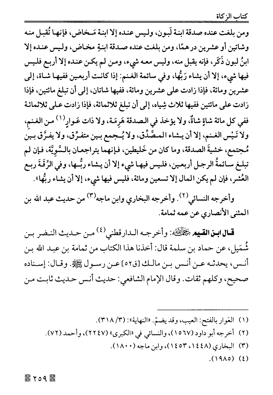 قال ابن القيم - رحمه الله -: وأخرجه الدارقطني (¬٤) من حديث النضر بن شُمَيل، عن حماد بن سلمة قال: أخذنا هذا الكتاب من ثمامة بن عبد الله بن أنس، يحدثه عن أنس بن مالك [ق ٥٢] عن رسول - صلى الله عليه وسلم -. وقال: إسناده صحيح، وكلهم ثقات. وقال الإمام الشافعي: حديث أنس حديث ثابت من
