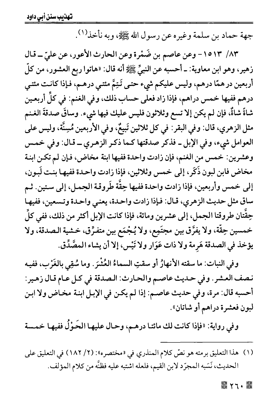 ٨٣/ ١٥١٣ - وعن عاصم بن ضَمْرة وعن الحارث الأعور، عن عليّ ــ قال زهير، وهو ابن معاوية: ــ أحسبه عن النبيِّ - صلى الله عليه وسلم - أنه قال: «هاتوا ربع العشور، من كلّ أربعين درهمًا درهم، وليس عليكم شيء حتى تَتِمَّ مئتي درهم، فإذا كانت مئتي درهم ففيها خمس دراهم، فإذا زاد فعلى حساب ذلك، وفي الغنم: في كلِّ أربعين شاةً شاةٌ، فإن لم يكن إلا تسع وثلاثون فليس عليك فيها شيء. وساقَ صدقةَ الغنم مثل الزهري، قال: وفي البقر: في كل ثلاثين تَبيعٌ، وفي الأربعين مُسِنَّة، وليس على العوامل شيء، وفي الإبل ــ فذكر صدقتها كما ذكر الزهري ــ قال: وفي خمس وعشرين: خمس من الغنم، فإن زادت واحدة ففيها ابنة مخاض، فإن لم تكن ابنة مخاض فابن لبون ذَكَر، إلى خمس وثلاثين، فإذا زادت واحدة ففيها بنت لَبون، إلى خمس وأربعين، فإذا زادت واحدة ففيها حِقَّة طَروقة الجمل، إلى ستين. ثم ساق مثل حديث الزهري، قال: فإذا زادت واحدة، يعني واحدة وتسعين، ففيها حِقَّتان طروقتا الجمل، إلى عشرين ومائة، فإذا كانت الإبل أكثر من ذلك، ففي كلِّ خمسين حِقّة، ولا يفرَّق بين مجتَمِع، ولا يُجْمَع بين متفرِّق، خشية الصدقة، ولا يؤخذ في الصدقة هَرِمة ولا ذات عَوَار ولا تَيْس، إلا أن يشاء المصَّدِّق.
