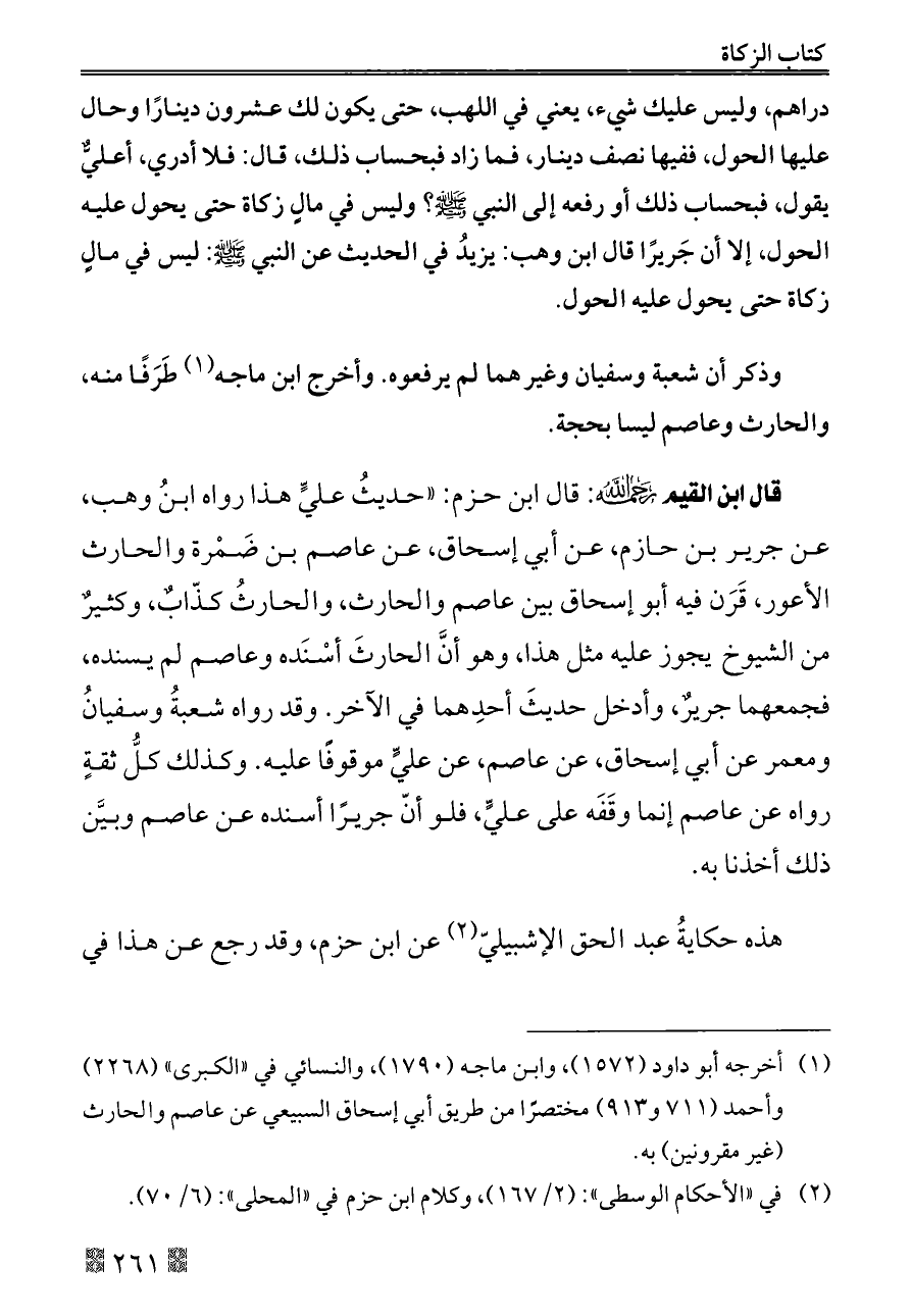 قال ابن القيم - رحمه الله -: قال ابن حزم: «حديثُ عليٍّ هذا رواه ابنُ وهب، عن جرير بن حازم، عن أبي إسحاق، عن عاصم بن ضَمْرة والحارث الأعور, قَرَن فيه أبو إسحاق بين عاصم والحارث, والحارثُ كذّابٌ, وكثيرٌ من الشيوخ يجوز عليه مثل هذا, وهو أنَّ الحارثَ أسْنَده وعاصم لم يسنده, فجمعهما جريرٌ، وأدخل حديثَ أحدِهما في الآخر. وقد رواه شعبةُ وسفيانُ ومعمر عن أبي إسحاق، عن عاصم، عن عليٍّ موقوفًا عليه. وكذلك كلُّ ثقةٍ رواه عن عاصم إنما وقَفَه على عليٍّ، فلو أنّ جريرًا أسنده عن عاصم وبيَّن ذلك أخذنا به.