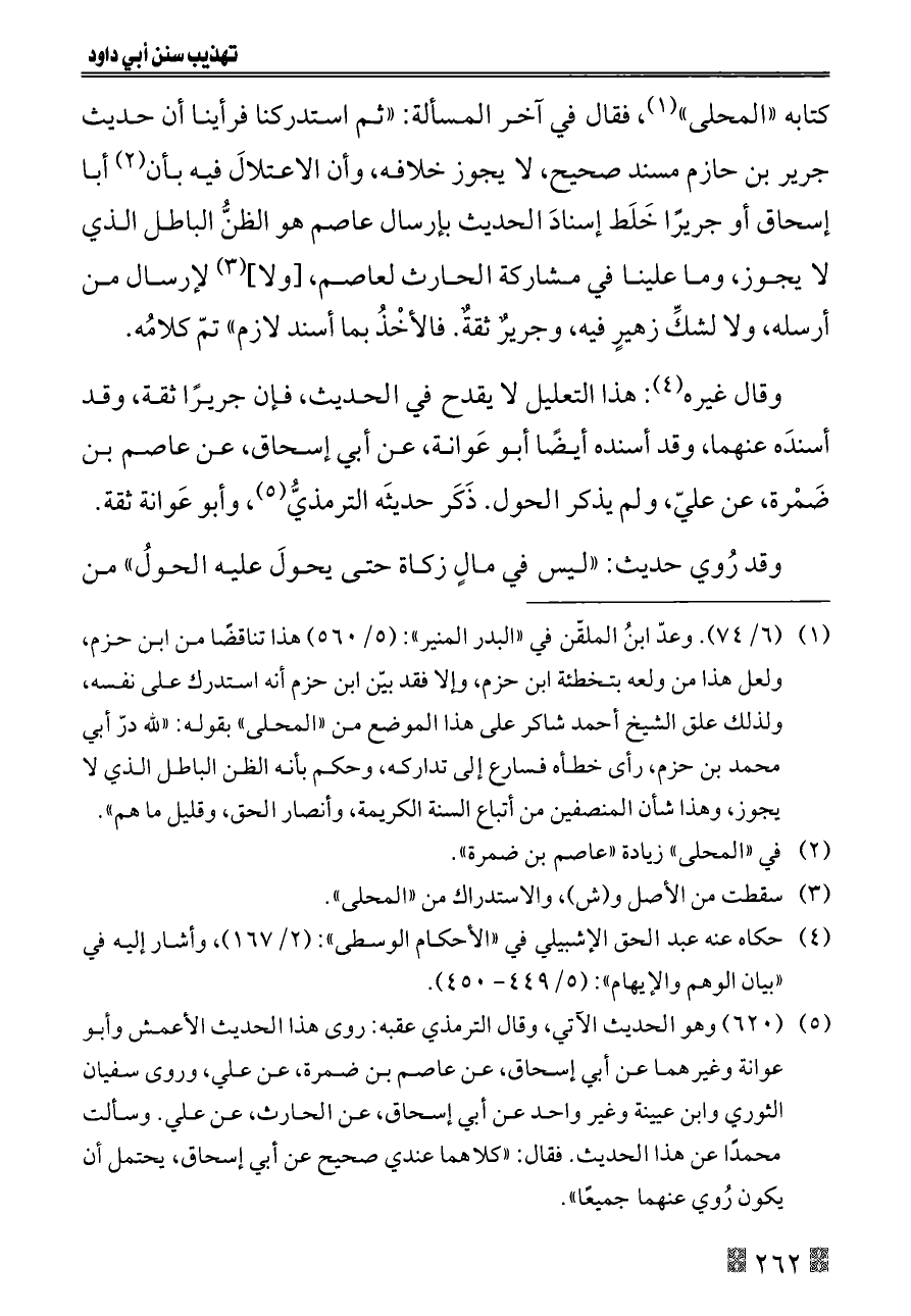 كتابه «المحلى» (¬١) , فقال في آخر المسألة: «ثم استدركنا فرأينا أن حديث جرير بن حازم مسند صحيح, لا يجوز خلافه, وأن الاعتلالَ فيه بأن (¬٢) أبا إسحاق أو جريرًا خَلَط إسنادَ الحديث بإرسال عاصم هو الظنُّ الباطل الذي لا يجوز, وما علينا في مشاركة الحارث لعاصم, [ولا] (¬٣) لإرسال من أرسله, ولا لشكِّ زهيرٍ فيه, وجريرٌ ثقةٌ. فالأخْذُ بما أسند لازم» تمّ كلامُه.