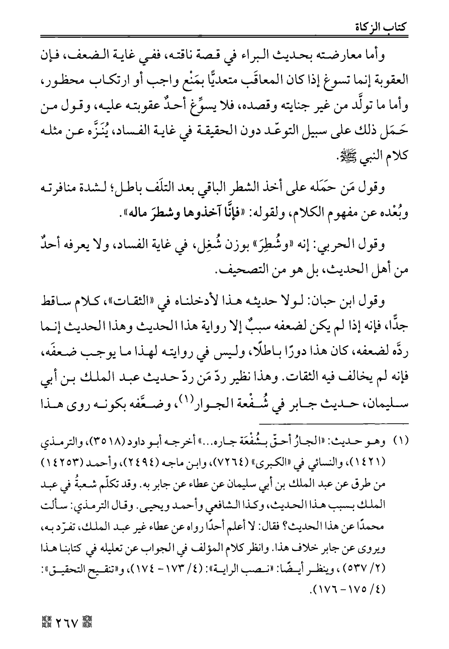 وقول مَن حَمَله على أخذ الشطر الباقي بعد التلَف باطل؛ لشدة منافرته وبُعْده عن مفهوم الكلام، ولقوله: «فإنَّا آخذوها وشطرَ ماله».