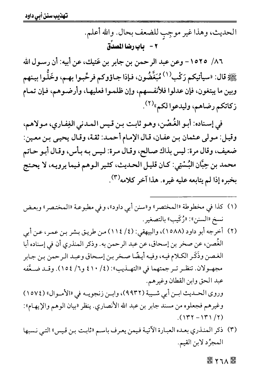 (¬٣). ذكر المنذري بعده العبارة الآتية فيمن يعرف باسم «ثابت بن قيس» التي نسبها المجرِّد لابن القيم.