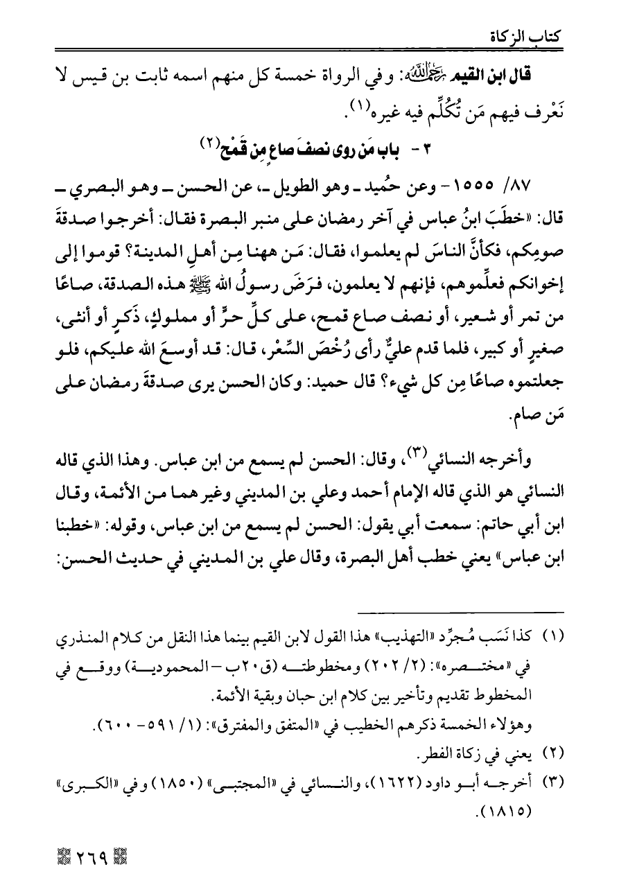٨٧/ ١٥٥٥ - وعن حُميد ــ وهو الطويل ــ، عن الحسن ــ وهو البصري ــ قال: «خطَبَ ابنُ عباس في آخر رمضان على منبر البصرة فقال: أخرجوا صدقةَ صومِكم، فكأنَّ الناسَ لم يعلموا، فقال: مَن ههنا مِن أهلِ المدينة؟ قوموا إلى إخوانكم فعلِّموهم، فإنهم لا يعلمون، فرَضَ رسولُ الله - صلى الله عليه وسلم - هذه الصدقة، صاعًا من تمر أو شعير، أو نصف صاع قمح، على كلِّ حرٍّ أو مملوكٍ، ذَكرٍ أو أنثى، صغيرٍ أو كبير، فلما قدم عليٌّ رأى رُخْصَ السِّعْر، قال: قد أوسعَ الله عليكم، فلو جعلتموه صاعًا مِن كل شيء؟ قال حميد: وكان الحسن يرى صدقةَ رمضان على مَن صام.