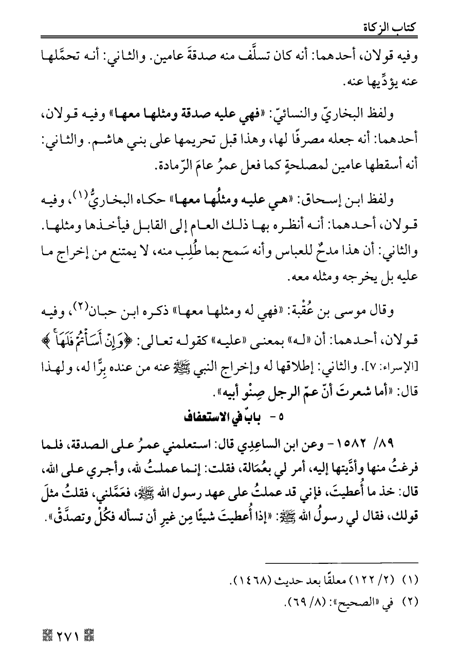 ولفظ البخاريّ والنسائيّ: «فهي عليه صدقة ومثلها معها» وفيه قولان، أحدهما: أنه جعله مصرفًا لها، وهذا قبل تحريمها على بني هاشم. والثاني: أنه أسقطها عامين لمصلحةٍ كما فعل عمرُ عامَ الرّمادة.