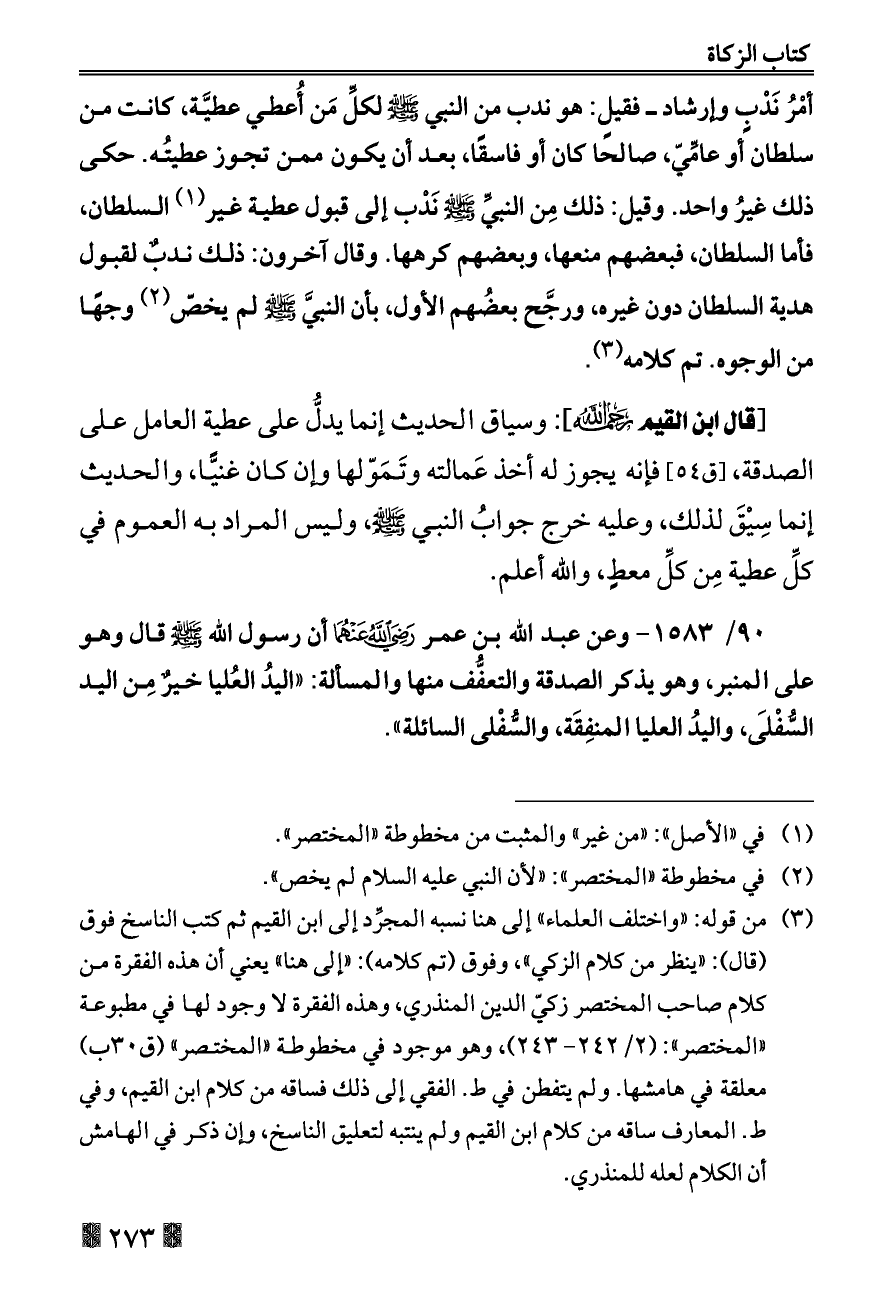 ٩٠/ ١٥٨٣ - وعن عبد الله بن عمر - رضي الله عنهما - أن رسول الله - صلى الله عليه وسلم - قال وهو على المنبر، وهو يذكر الصدقة والتعفُّف منها والمسألة: «اليدُ العُليا خيرٌ مِن اليد السُّفْلَى، واليدُ العليا المنفِقَة، والسُّفْلى السائلة».
