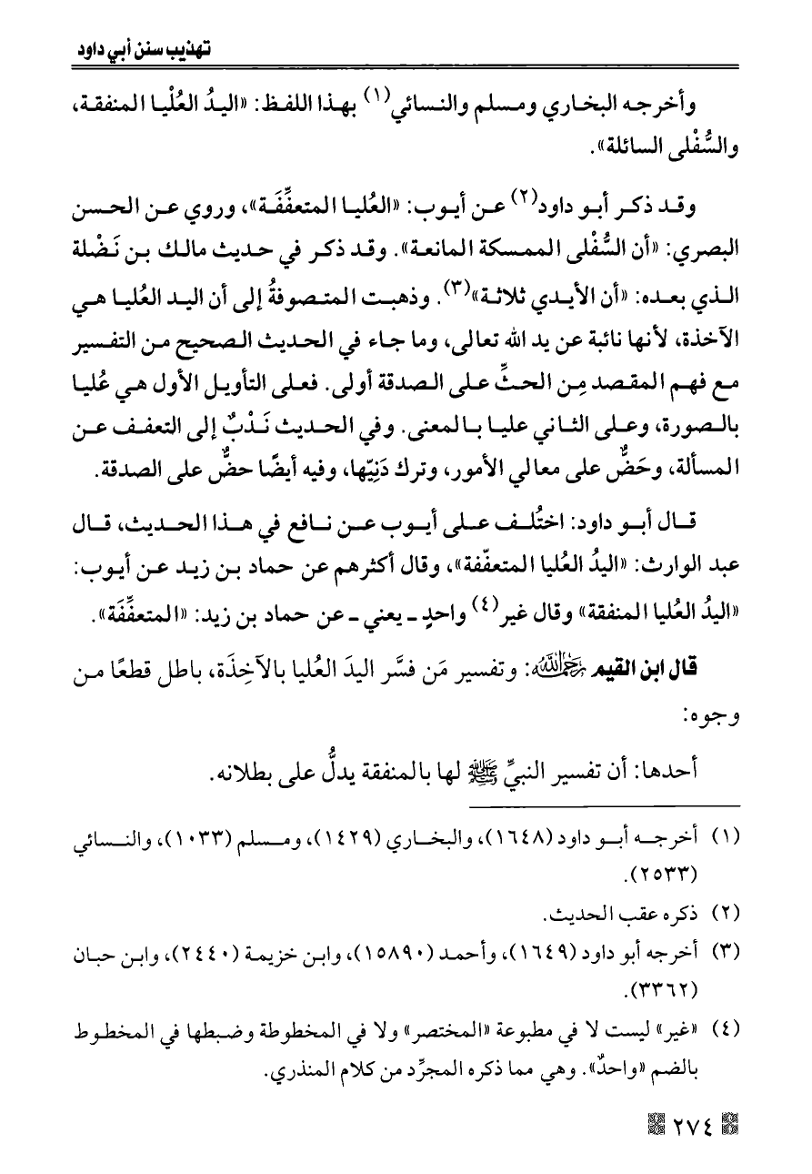 قال أبو داود: اختُلف على أيوب عن نافع في هذا الحديث، قال عبد الوارث: «اليدُ العُليا المتعفّفة»، وقال أكثرهم عن حماد بن زيد عن أيوب: «اليدُ العُليا المنفقة» وقال غير (¬٤) واحدٍ ــ يعني ــ عن حماد بن زيد: «المتعفِّفَة».