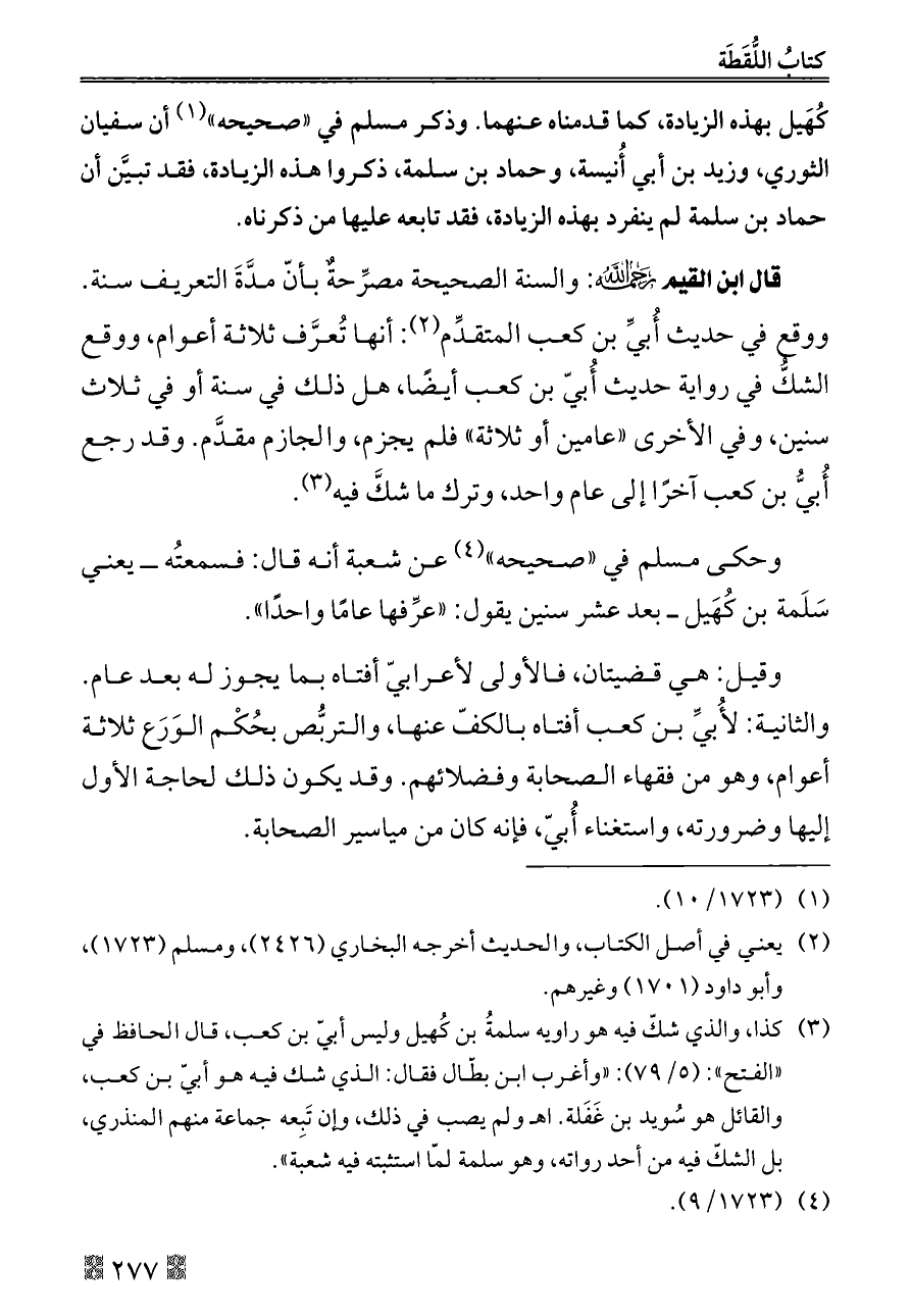 قال ابن القيم - رحمه الله -: والسنة الصحيحة مصرِّحةٌ بأنّ مدَّةَ التعريف سنة. ووقع في حديث أُبيِّ بن كعب المتقدِّم (¬٢): أنها تُعرَّف ثلاثة أعوام، ووقع الشكُّ في رواية حديث أُبيّ بن كعب أيضًا, هل ذلك في سنة أو في ثلاث سنين, وفي الأخرى «عامين أو ثلاثة» فلم يجزم, والجازم مقدَّم. وقد رجع أُبيُّ بن كعب آخرًا إلى عام واحد, وترك ما شكَّ فيه (¬٣).