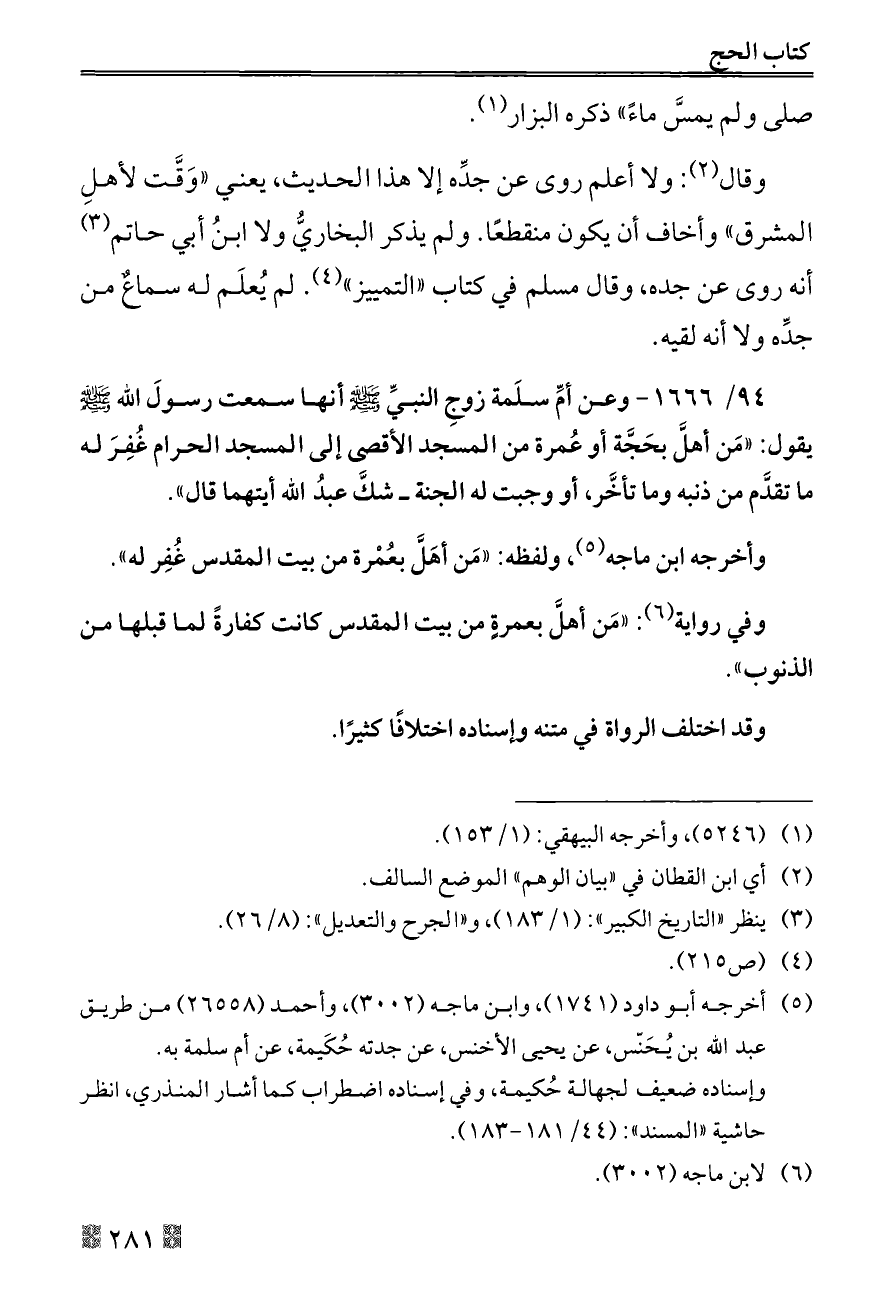 ٩٤/ ١٦٦٦ - وعن أمِّ سلَمة زوجِ النبيِّ - صلى الله عليه وسلم - أنها سمعت رسولَ الله - صلى الله عليه وسلم - يقول: «مَن أهلَّ بحَجَّة أو عُمرة من المسجد الأقصى إلى المسجد الحرام غُفِرَ له ما تقدَّم من ذنبه وما تأخَّر، أو وجبت له الجنة ــ شكَّ عبدُ الله أيتهما قال».