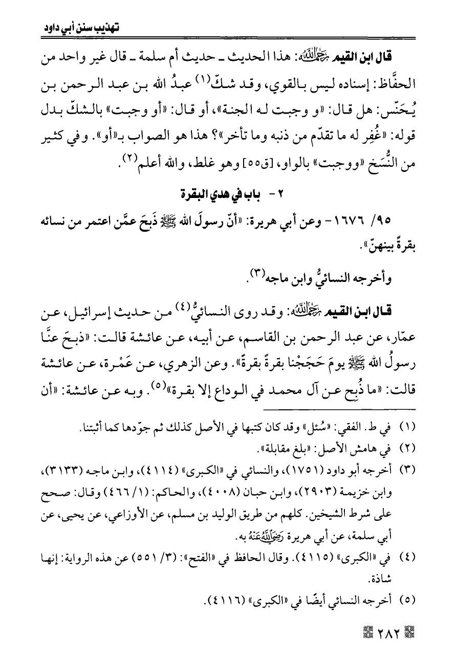 قال ابن القيم - رحمه الله -: هذا الحديث ــ حديث أم سلمة ــ قال غير واحد من الحفَّاظ: إسناده ليس بالقوي, وقد شكّ (¬١) عبدُ الله بن عبد الرحمن بن يُحَنّس: هل قال: «و وجبت له الجنة» , أو قال: «أو وجبت» بالشكّ بدل قوله: «غُفِر له ما تقدّم من ذنبه وما تأخر»؟ هذا هو الصواب بـ «أو». وفي كثير من النُّسَخ «ووجبت» بالواو, [ق ٥٥] وهو غلط، والله أعلم (¬٢).